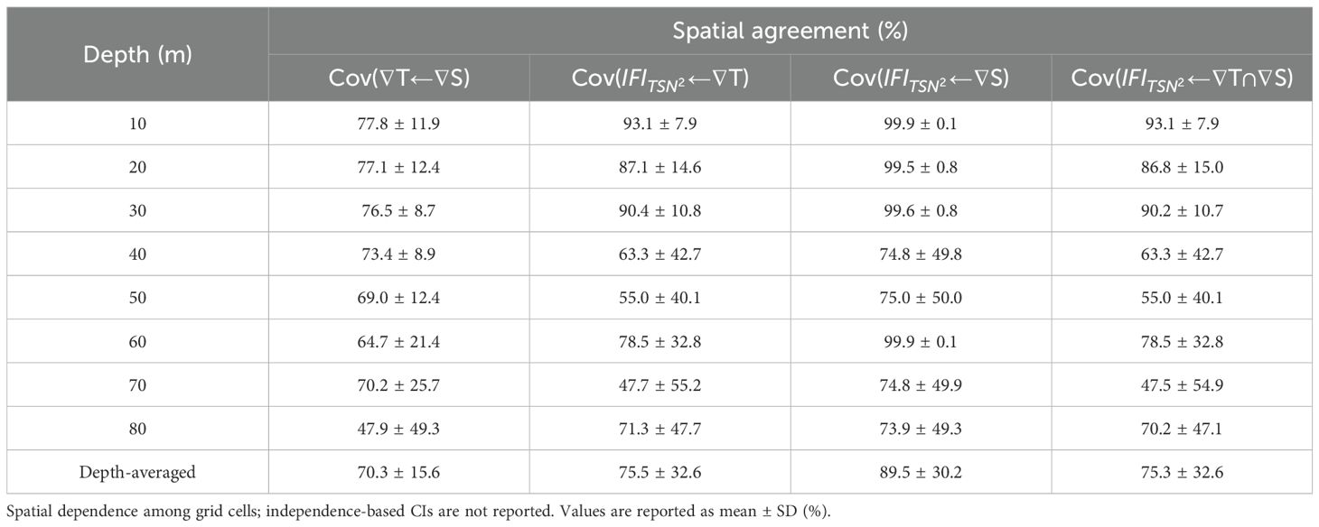 Using α–β layer weights, we recomputed with the same per-depth top-15% threshold. Bilateral spatial agreement with the PCA-weighted masks was high (depth-averaged 76.3% for Cov( ← ), 86.8% for Cov( ← )); agreement is strongest at 10–40 m and slightly weaker at 50–70 m (Supplementary Table S3).