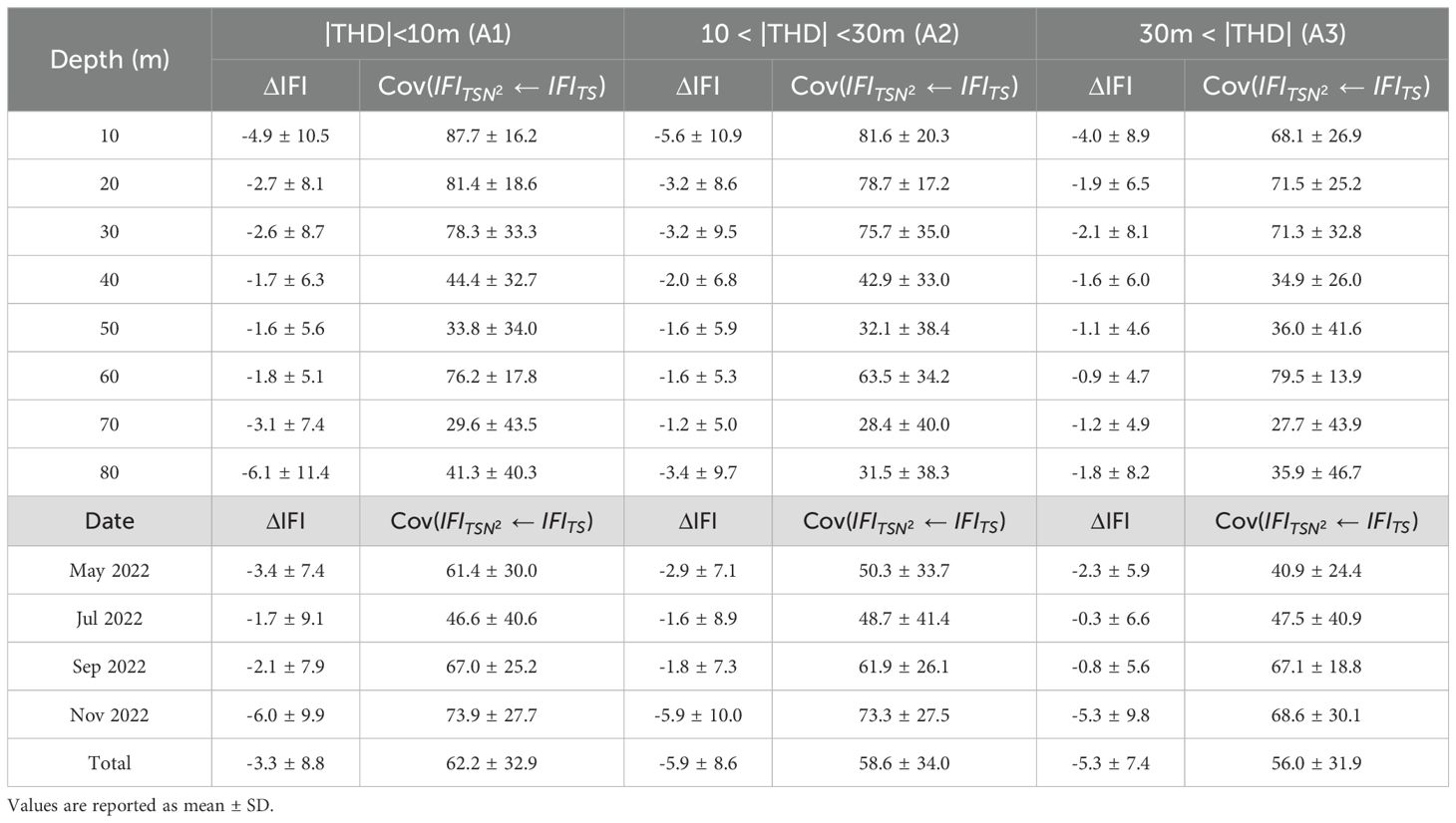 Table 3. Mean and standard deviation of ΔIFI, along with spatial agreement (%) between and , classified by the three ranges of ∣THD∣ (A1: ∣THD∣ < 10 m, A2: 10 < ∣THD∣ < 30 m, A3: ∣THD∣ > 30 m), for each depth layer and observation period.