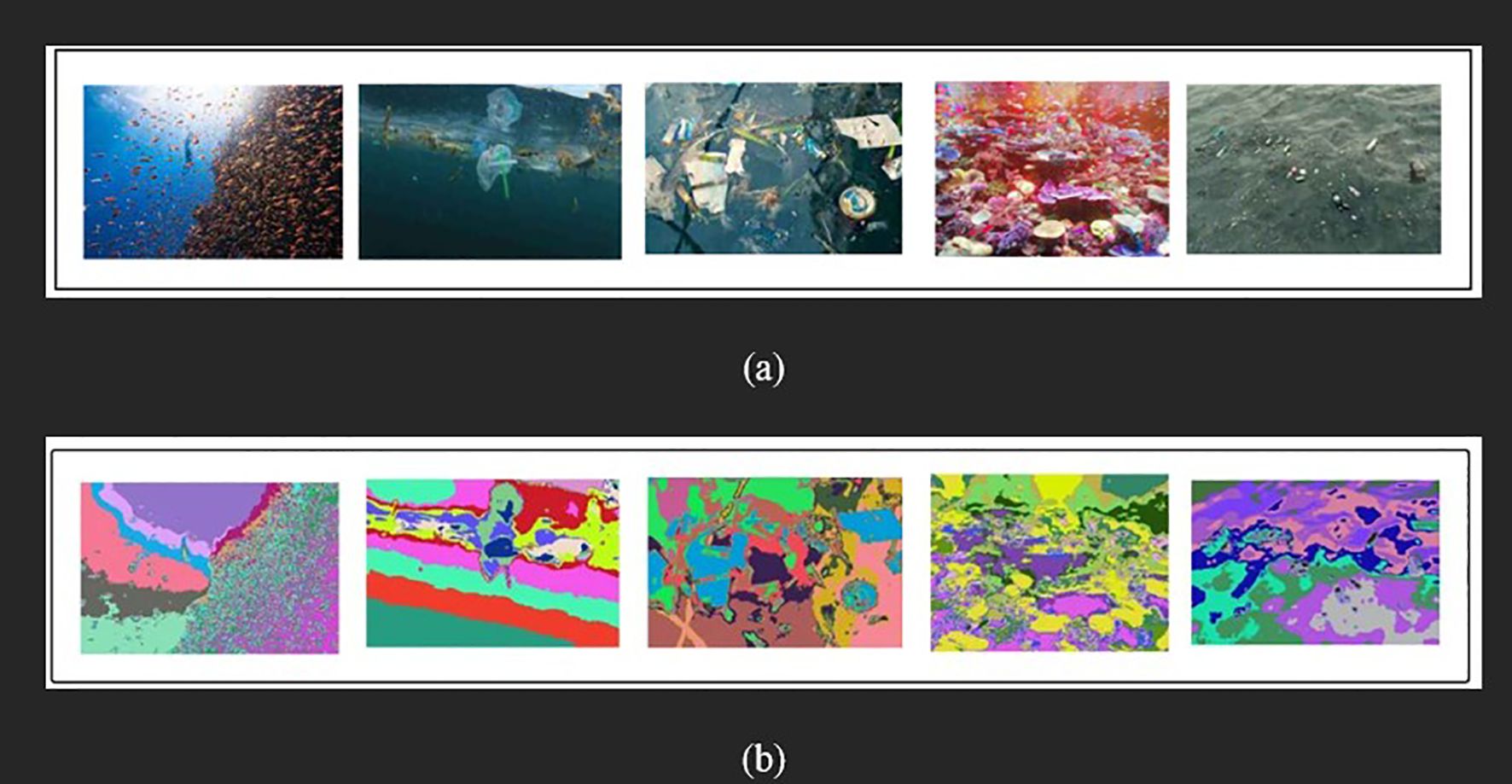 Figure 4 provides the stages of marine litter classification pre-processing. Subfigure (a) presents the original photos taken in marine settings, and they represent different kinds of litter. The same images are introduced in subfigure (b) following Papnotic segmentation technique, which is used to emphasise and isolate litter items in the background to facilitate analysis.