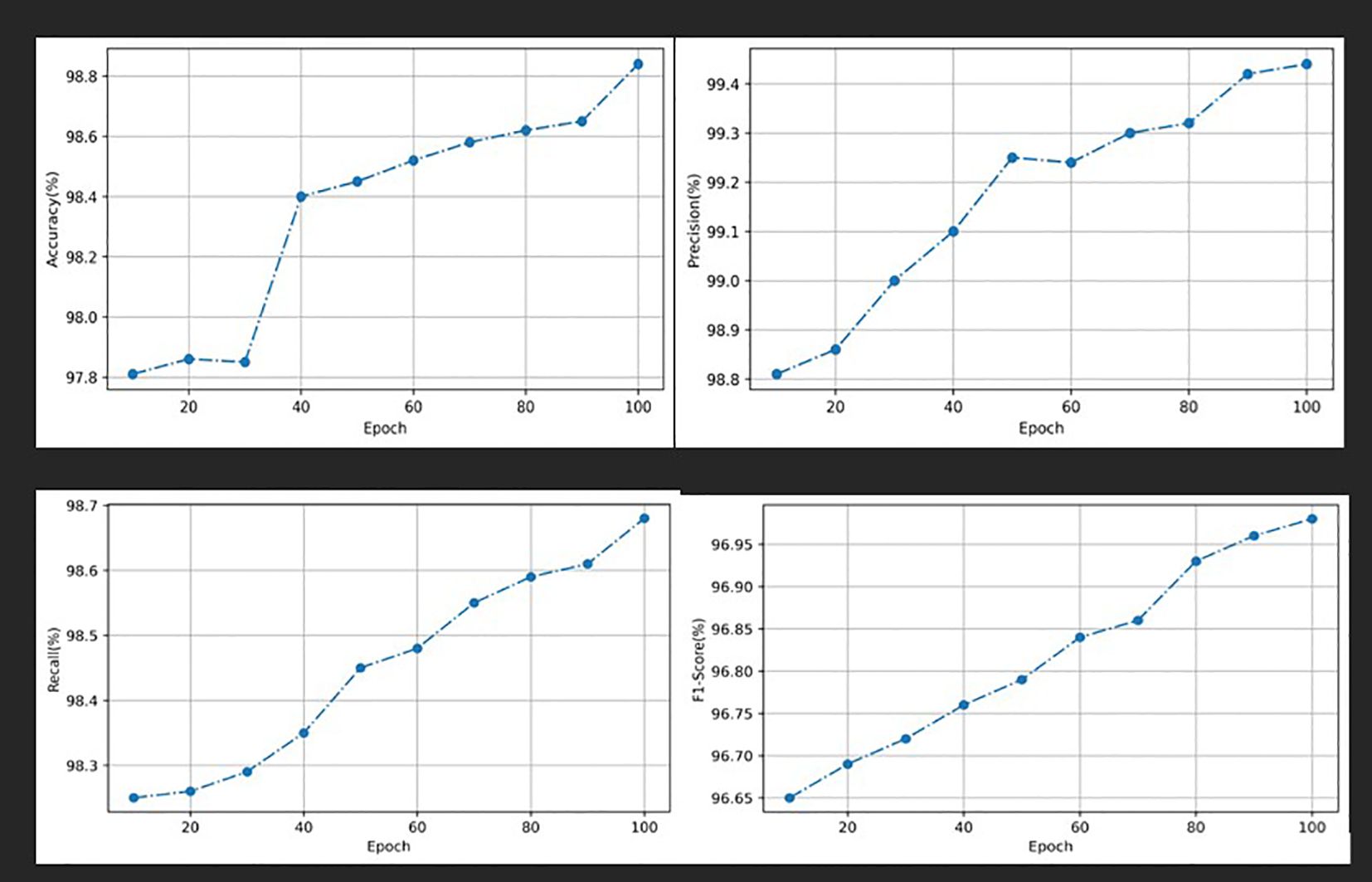Figure 5 represents the graphical representation of the performance metrics that change with epoch. Probably, it represents the metrics of accuracy, precision, recall, or F1-score as a function of training epochs used to optimise a model. The given visualisation helps track the model’s progress during training cycles and calculate convergence. The fluctuations in these metrics are analysed to optimise training strategies, overfitting or underfitting, and due to them, the most appropriate model checkpoints can be chosen. This knowledge is essential in the development of machine learning models in multiple fields, which guarantee high-level performance and extrapolation to previously unknown data.