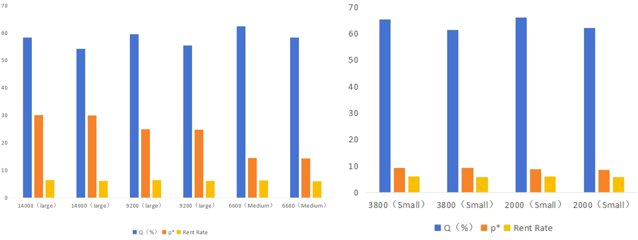 Numerical methods (Newton-Raphson iteration) were employed to solve the model equilibrium, calculating equilibrium quotations, transaction probabilities, and seller expected residuals for ten major container vessel types (Equations 1–3). The equilibrium results presented in Section 4-1, based on the assumption σi=7%, reveal the transaction patterns of different vessel types in the second-hand ship market. Table 2 provides a comprehensive overview, including the seller’s true cost (c), optimal asking price , probability of transaction , seller’s expected residual E[|c], , and rent rate. These data not only reflect the impact of information asymmetry on second-hand vessel transactions but also demonstrate how sellers leverage informational advantages to formulate pricing strategies, and how buyers make decisions based on quoted prices and their own beliefs.