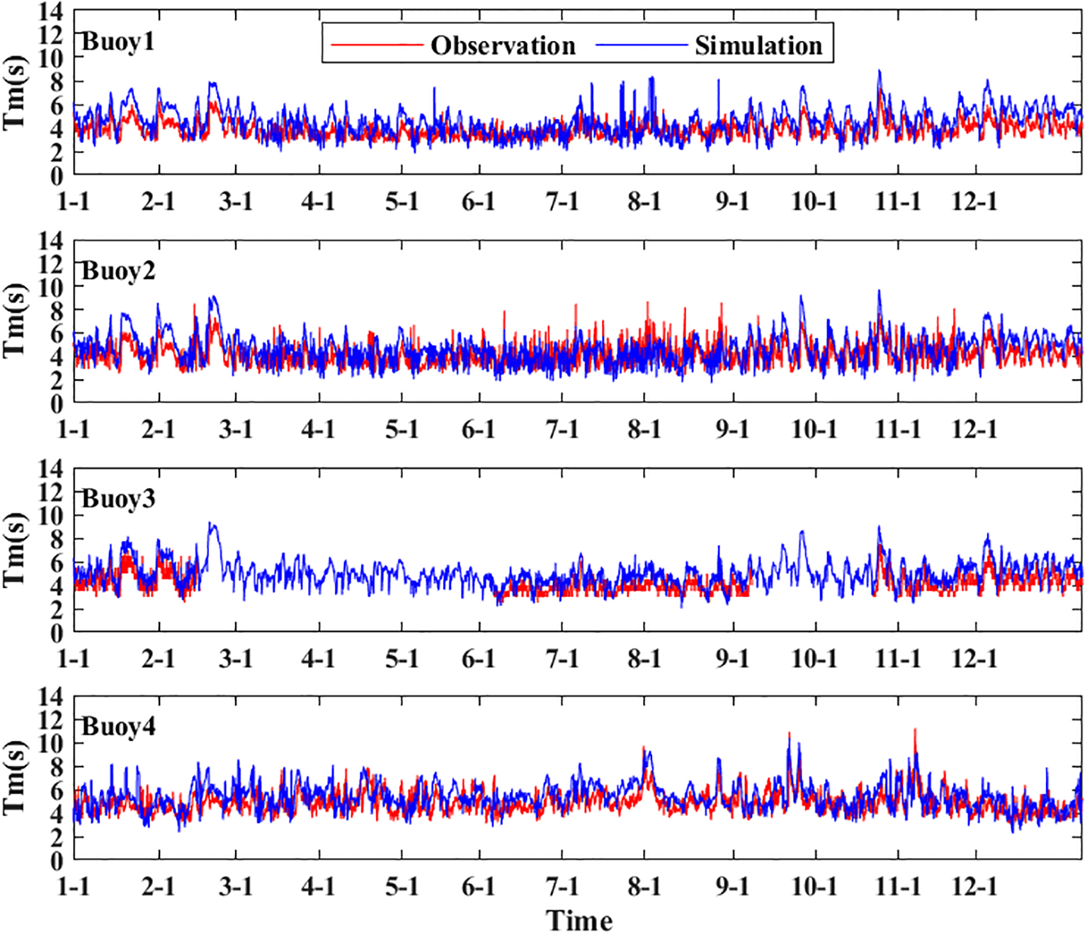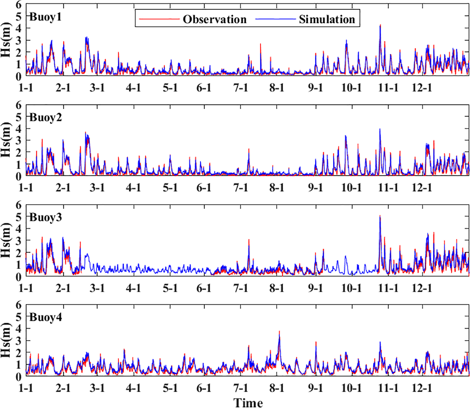 The MAE and RMSE of Hs and Tm are summarized in Table 4, and the comparison between hourly buoy observations and model simulations for the entire year of 2024 is shown in Figures 2, 3. Here, the x-axis represents the different month/day information in 2024. For buoy1, the MAE and RMSE of Hs are 0.149 m and 0.218 m, while the MAE and RMSE of Tm are 0.97 s and 1.14 s. For buoy2, the MAE and RMSE of Hs are 0.152 m and 0.217 m, and the MAE and RMSE of Tm are 0.93 s and 1.19 s. For buoy3, the MAE and RMSE of Hs are 0.202 m and 0.278 m, and the MAE and RMSE of Tm are 0.97 s and 1.09 s. For buoy4, the MAE and RMSE of Hs are 0.202 m and 0.278 m, and the MAE and RMSE of Tm are 0.97 s and 1.09 s.