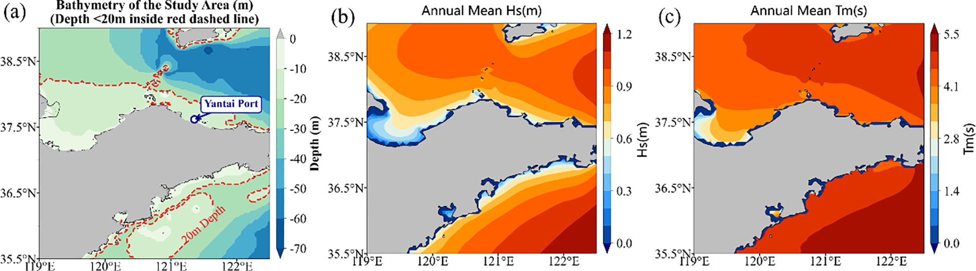 Bathymetry of the study area (a), Annual mean Hs(b), Annual mean Tm(c).