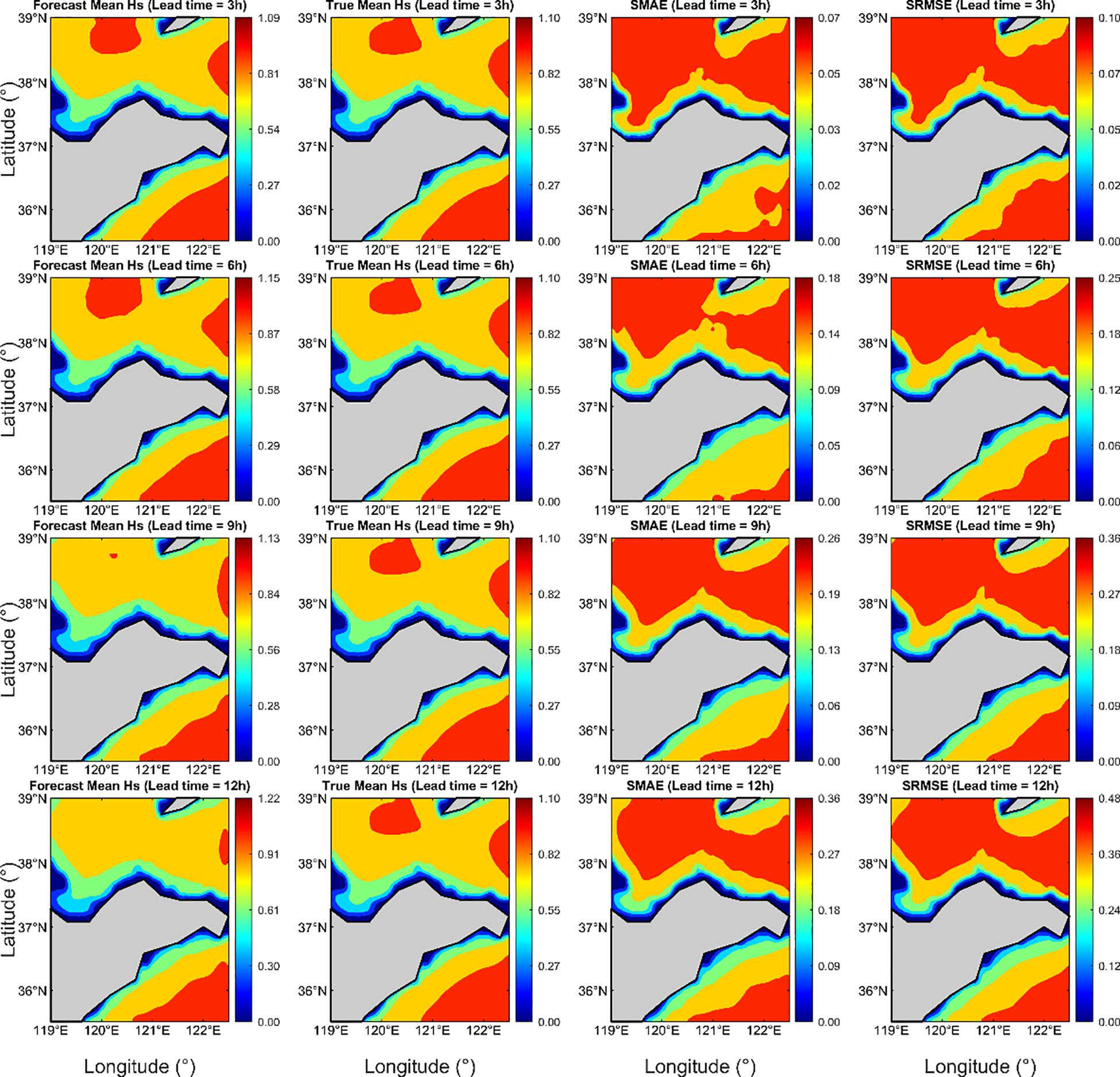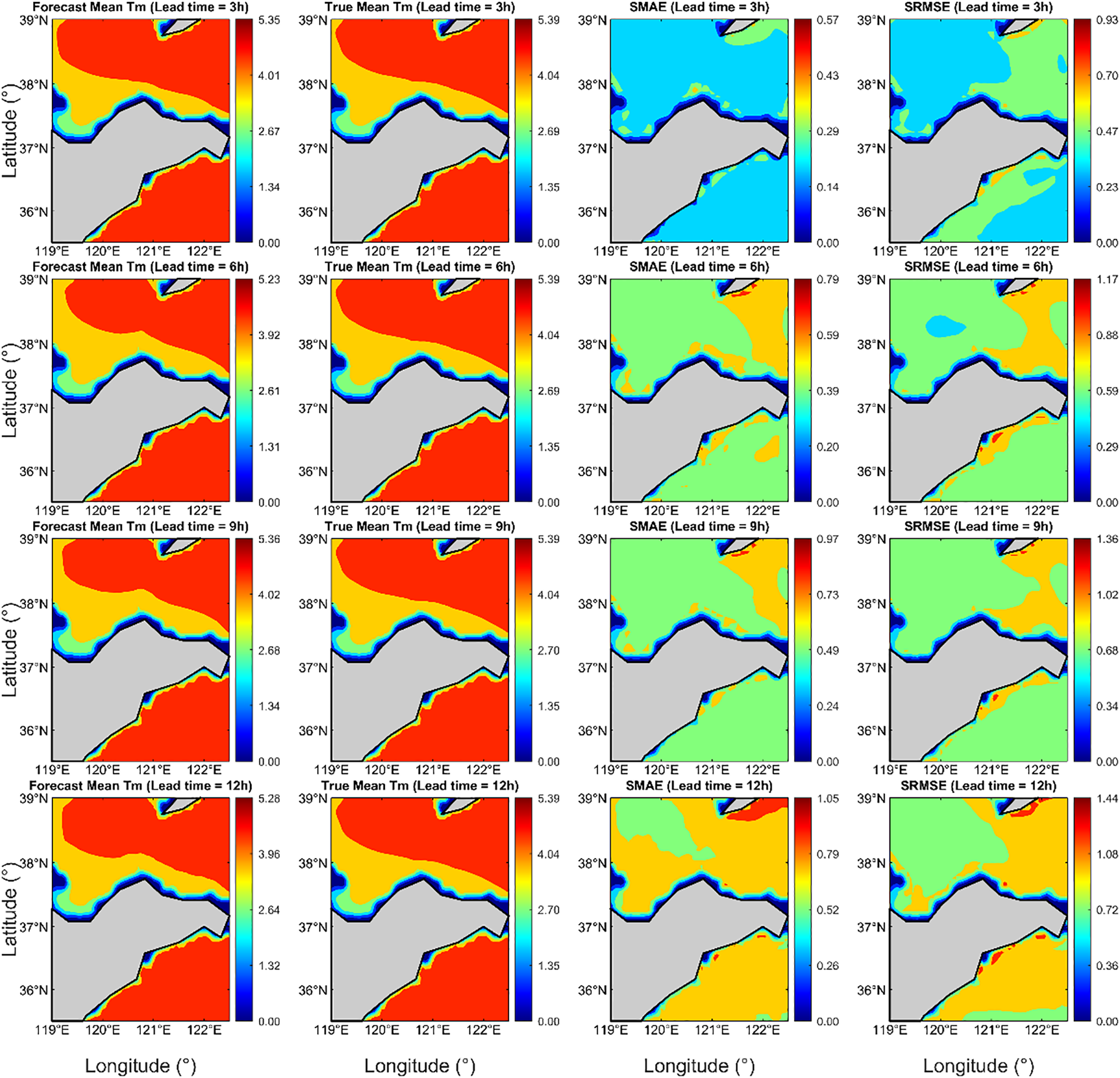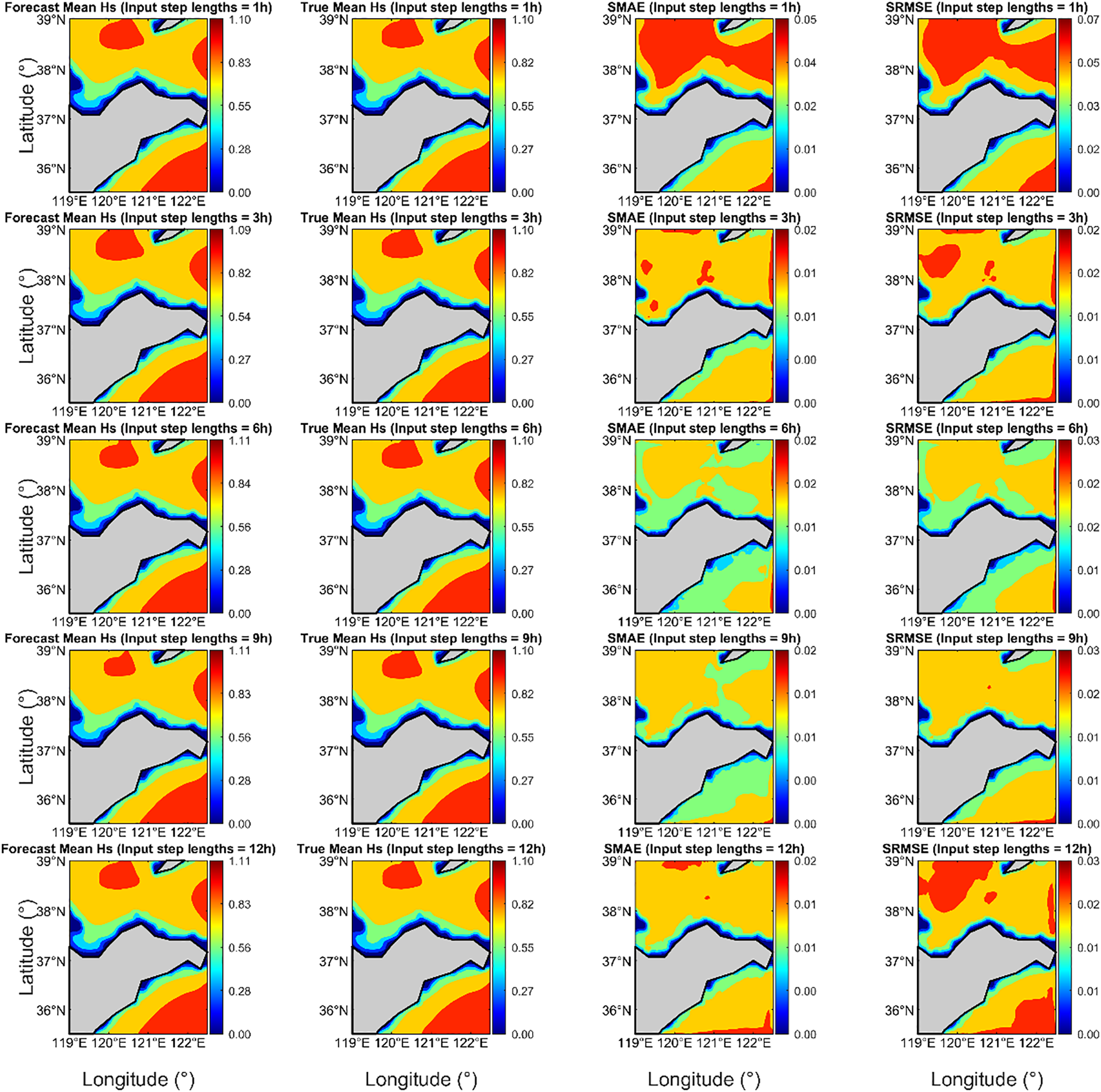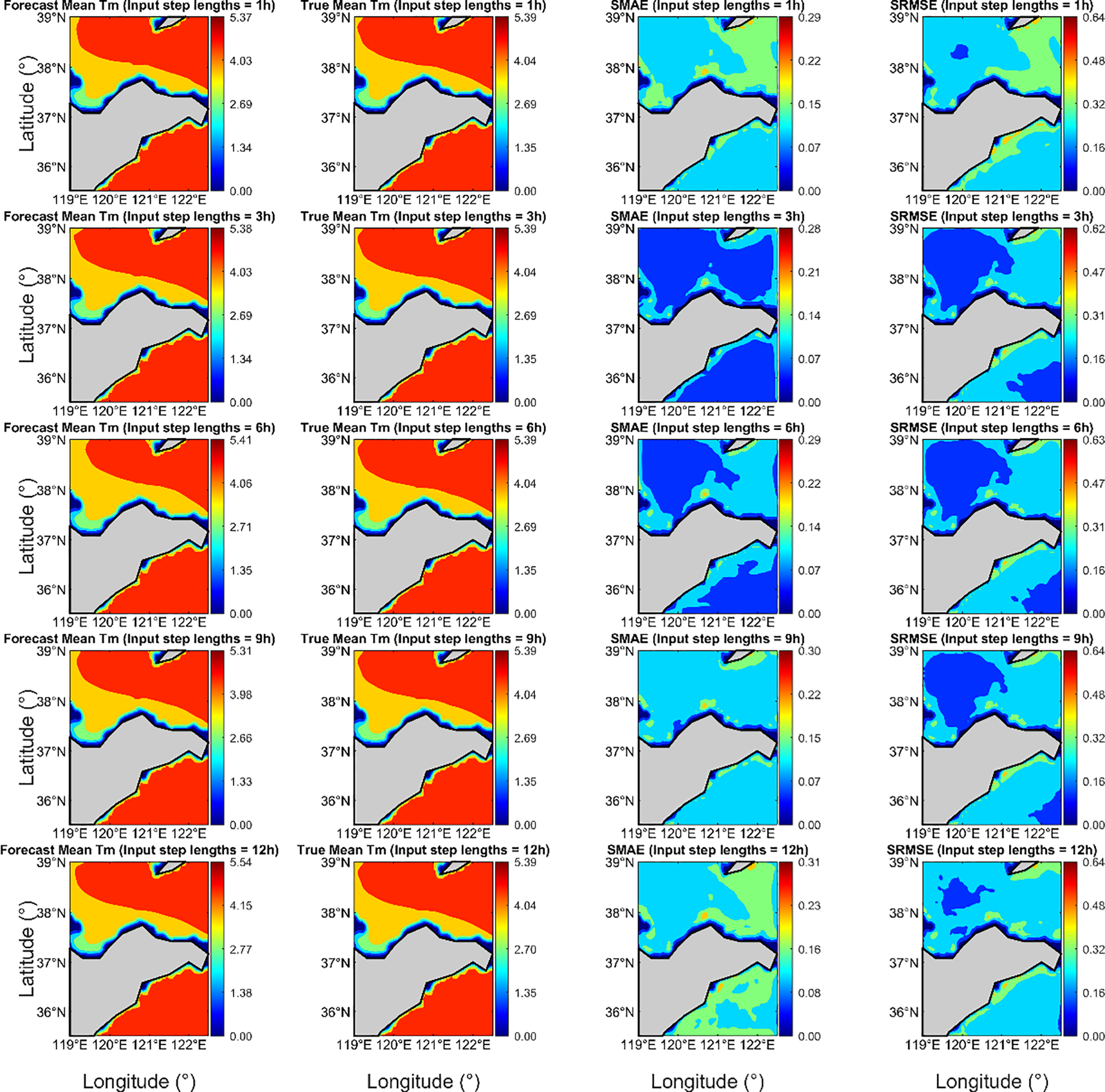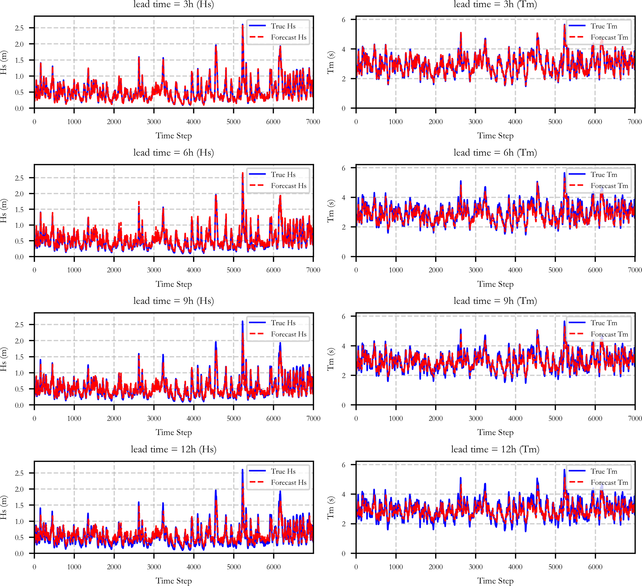 The optimal input step length for the model is 3 hours, achieving correlation coefficients (CC) of 0.9997 for Hs and 0.9969 for Tm. The mean absolute errors (MAE) are 0.0075 m and 0.0562 s, and the root mean square errors (RMSE) are 0.0149 m and 0.2014 s, respectively. Based on the 3-hour input step length, forecasts were conducted for lead times of 3, 6, 9, and 12 hours. As the forecast lead time increased, prediction accuracy declined, but the model still effectively captured the main trends of Hs and Tm.