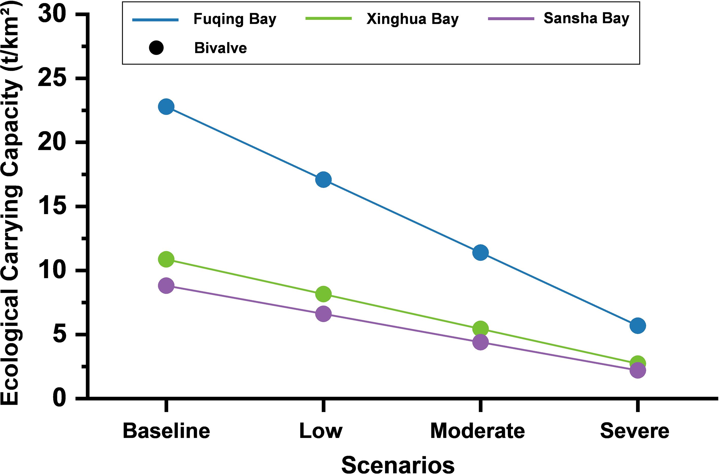 By incorporating such stressors, the authors aimed to evaluate the sensitivity and vulnerability of the bay, with particular attention to changes in ecological carrying capacity. Bivalve ecological carrying capacity was selected as a focal metric because suspension-feeding bivalves play a central ecological and management role in such coastal systems. Ecologically, bivalves represent a major benthic filter-feeding component, and they regulate particulate organic matter, and participate to a great extent in nutrient removal and water-quality improvement (van der Schatte Olivier et al., 2020). In addition, their biomass and filtration capacity influence energy transfer efficiency and the stability of lower trophic levels, making them sensitive indicators of ecosystem responses to climate-driven changes in primary production, oxygen availability, and hydrological conditions. From a management perspective, bivalve aquaculture is the dominant human activity in the three bays and constitutes a key sector for regional livelihoods and coastal blue-carbon strategies. Therefore, ecological carrying capacity estimation is essential for balancing production goals with ecosystem integrity, and the Ecopath framework has been applied extensively to quantify such limits in coastal and estuarine systems (Byron et al., 2011; Outeiro et al., 2018; Zhang et al., 2023). Focusing on bivalve ecological carrying capacity provides both an ecologically meaningful and management-relevant indicator for assessing system-specific climate vulnerability.