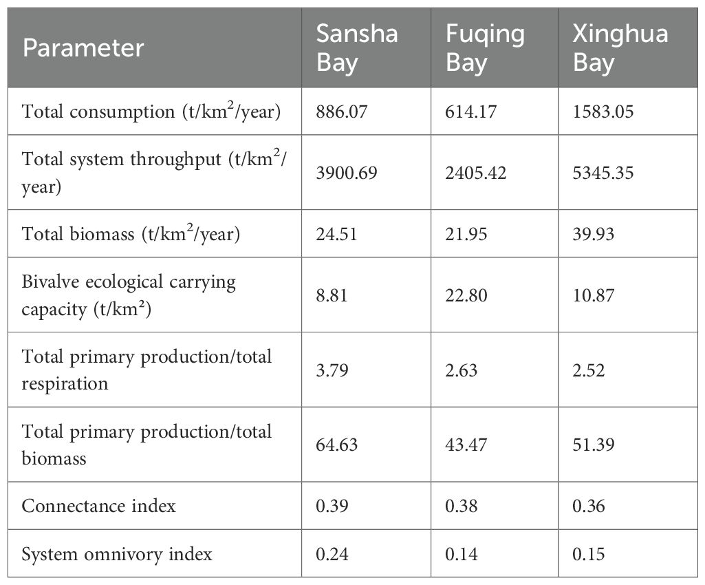 In each bay, species were grouped according to trophic guild, vertical habitat, feeding preference and prey spectrum, similarity in body size, and metabolic characteristics. These traits jointly determine their trophic position and contribution to local energy pathways. Functional groups preserve the dominant energy flows and trophic interactions even when species composition differs across systems (Plaganyi, 2007). Considering Ecopath requires complete parameterization for each group, data availability (biomass, P/B, Q/B, and diet composition) also influenced aggregation. The group structure was grounded in the species recorded in the field surveys of Fuqing, Sansha, and Xinghua Bays, ensuring representation of all major trophic pathways, including primary producers, zooplankton, benthic invertebrates, bivalves, small pelagic fishes, demersal predators, and top predators. Because species composition and hydrodynamic regimes differ substantially among the three bays, enforcing identical group structures would have grouped ecologically dissimilar species and reduced model realism. Instead, a consistent trophic-guild framework was applied across all bays while allowing species-level membership to vary according to local assemblages. This maintains ecological meaning within each system while preserving comparability across systems for cross-bay analysis.