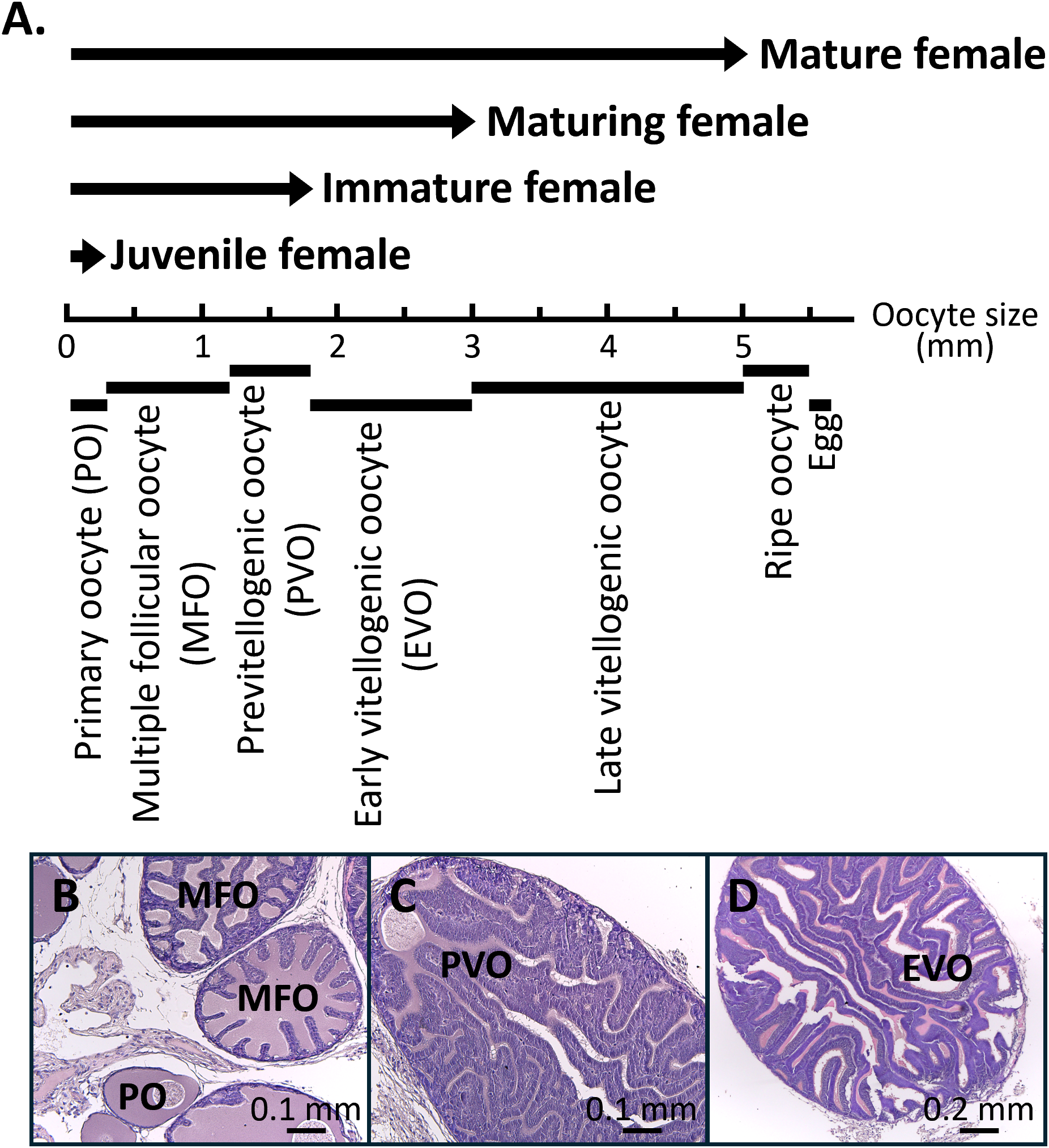 Relationship between the oocyte size, oocyte stages, and female reproductive stages. (A) Seven oocyte stages classified by size: primary oocyte (<300 µm), multiple follicular oocyte stage (0.3-1.2 mm), previtellogenic oocyte (1.2-1.8 mm), early vitellogenic oocyte (1.8-3 mm), late vitellogenic oocyte (3-5 mm), ripe oocyte (5-5.5 mm), and egg (>5.5 mm). Four female reproductive stages were defined according to oocyte development: juvenile female (up to the primary oocyte stage), immature female (up to the previtellogenic oocyte stage), maturing female (up to the early vitellogenic oocyte stage), and mature female (containing eggs in the oviduct). (B-D) H&E staining of representative oocyte stages. PO, primary oocyte; MFO, multiple follicular oocyte stage; PVO, previtellogenic oocyte; EVO, early vitellogenic oocyte.