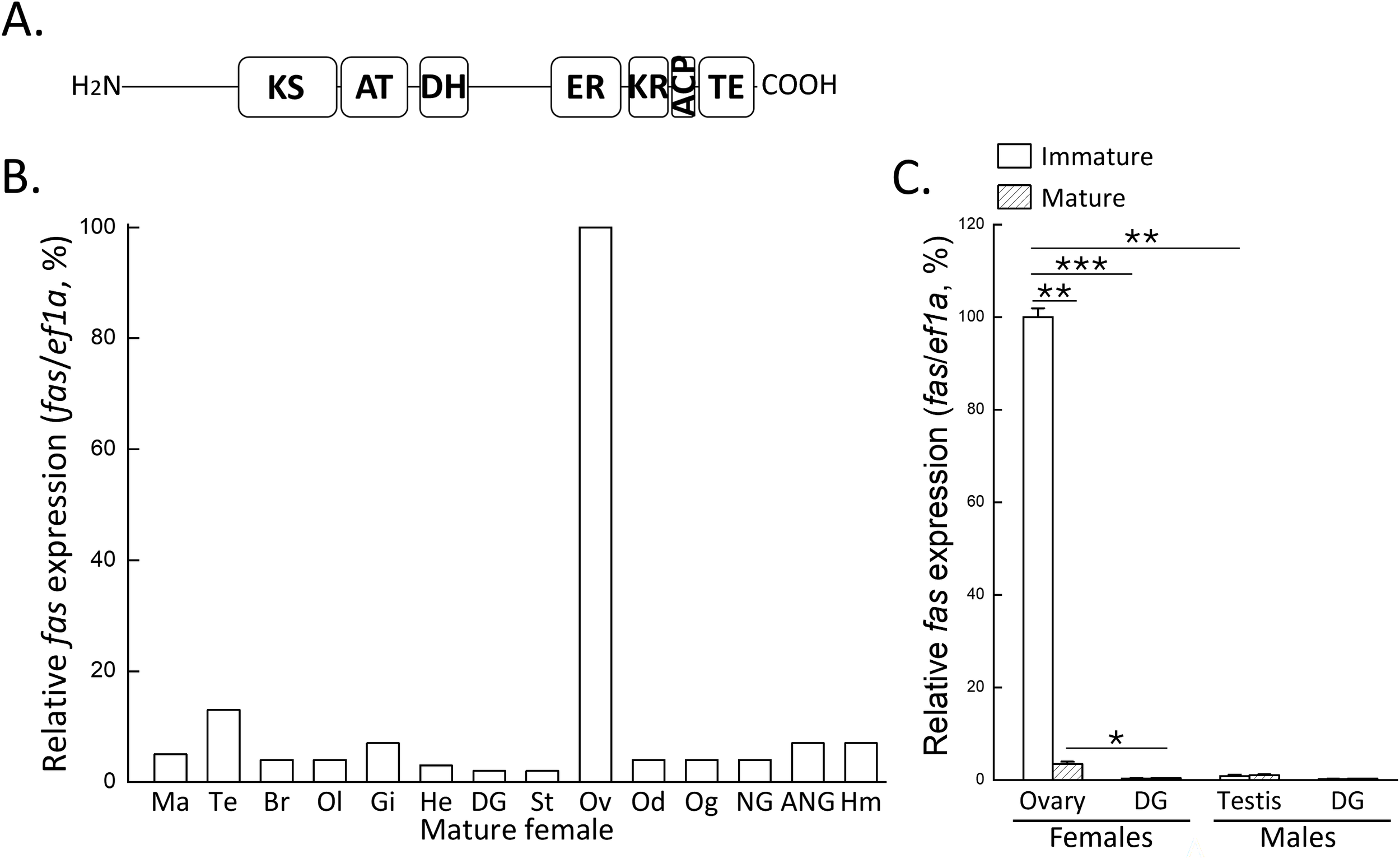 Domain structure of FAS and its mRNA expression profiles in tissues and reproductive stages. (A) Predicted domain structure of FAS, including ketosynthase (KS), acyltransferase (AT), dehydratase (DH), enoylreductase (ER), ketoreductase (KR), acyl carrier protein (ACP), and thioesterase (TE). (B) qPCR analysis of fas mRNA expression in various tissues of mature female. (C) qPCR analysis of fas mRNA expression in gonads and digestive gland of immature and mature individuals of both sexes. Expression levels were normalized to ef1a, and the highest expression was set to 100%. Statistical significance was determined by Student’s t-test: P < 0.05 (*), P < 0.01 (**), P < 0.001 (***). Ma, mantle; Te, tentacle; Br, brain; Ol, optic lobe; Gi, gill; He, heart; DG, digestive gland; St, stomach; Ov, ovary; Od, oviduct; Og, oviductal gland; NG, nidamental gland; ANG, accessory nidamental gland; Hm, hemocytes.