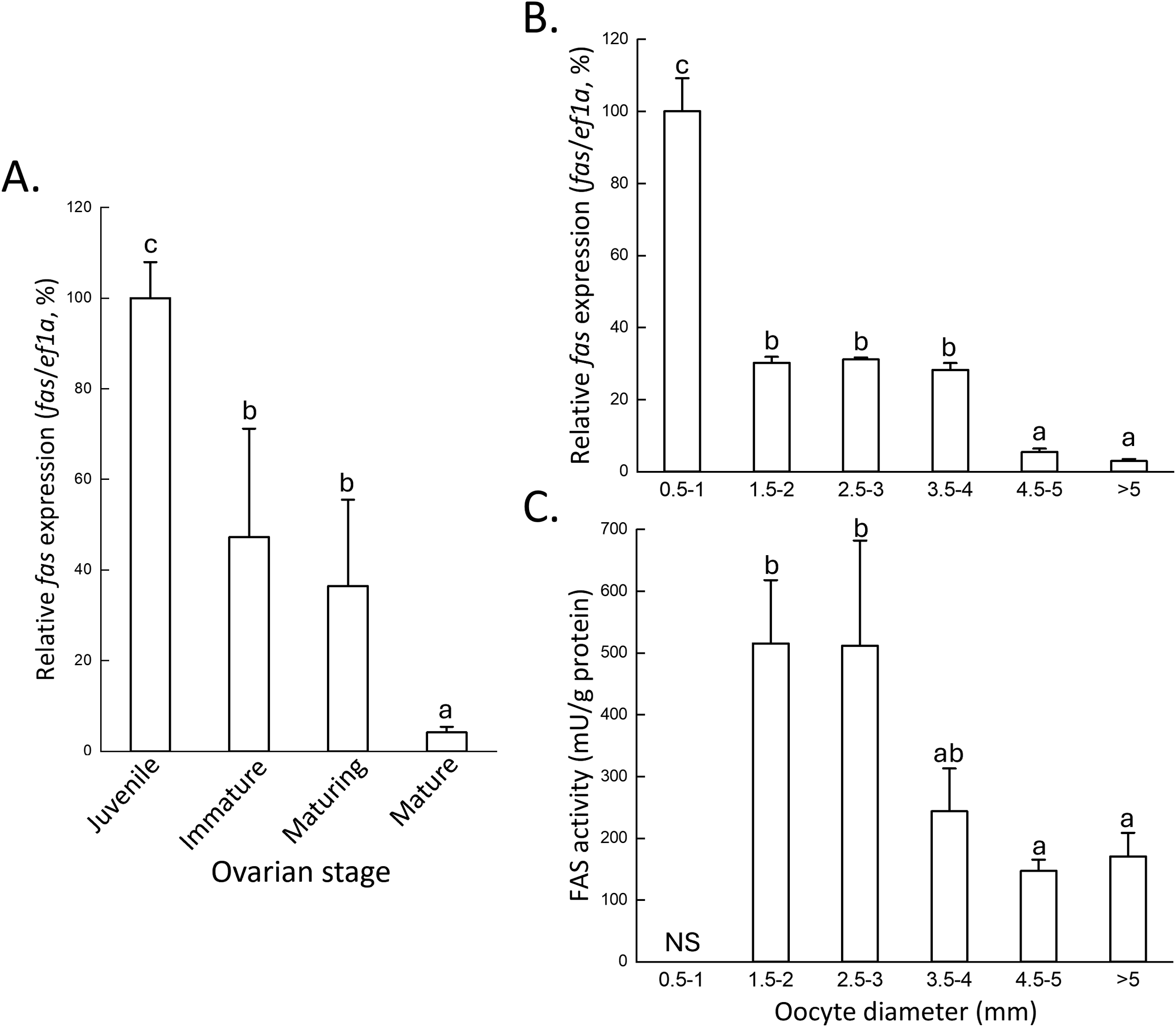 fas mRNA expression profiles and enzymatic activity across ovarian and oocyte stages. (A) qPCR analysis of fas mRNA expression in ovarian stages: juvenile (up to the primary oocyte), immature (up to the previtellogenic oocyte), maturing (up to the early vitellogenic oocyte), and mature (eggs in the oviductal gland). (B) qPCR analysis of fas mRNA expression. (C) FAS enzymatic activity in different oocyte stages. The relationship between oocyte size and stage is shown in Figure 1. Expression levels were normalized to ef1a, and the highest expression was set to 100%. Statistical significance was determined by one-way ANOVA followed by Tukey’s multiple comparison test (P < 0.05), indicated by different letters. NS, no sample.