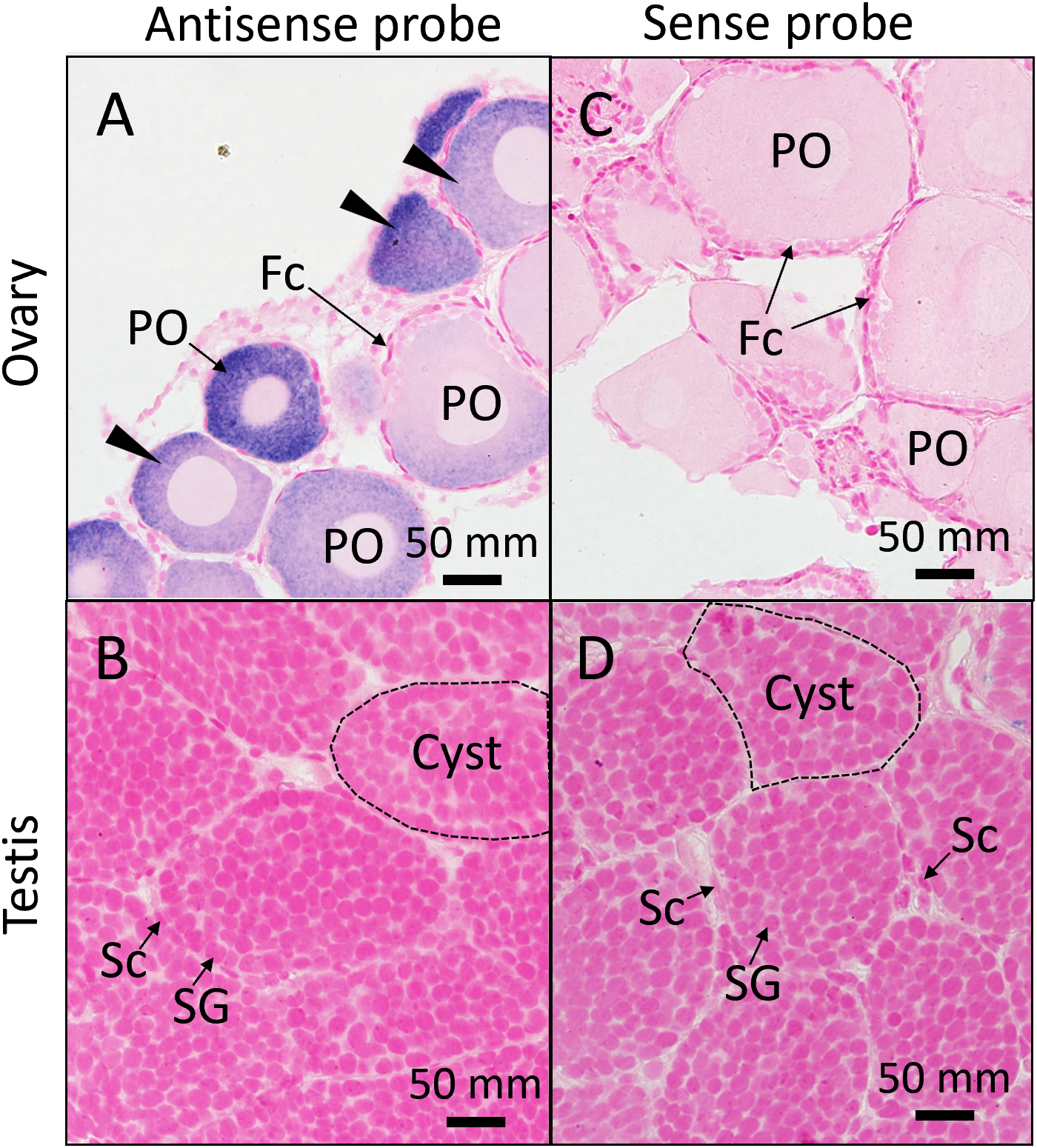Distribution of fas mRNA in juvenile gonads. In situ hybridization (ISH) with an antisense probe detected fas mRNA in the ovary (A) and testis (B) of juvenile individuals. Sense probes were used as negative control in the ovary (C) and testis (D). Black arrowheads indicate ISH signals. Fc, follicle cell; PO, primary oocyte; Sc, Sertoli cell; Sg, spermatogonia.