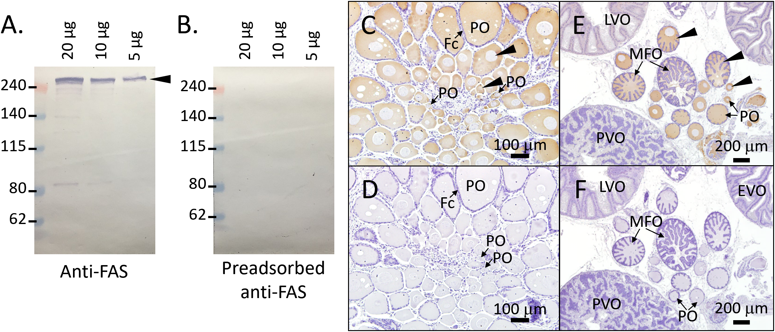 Specificity of anti-FAS antiserum and distribution of FAS protein in the ovary. (A) Western blotting (WB) with anti-FAS antiserum in ovarian protein extracts. (B) WB with preadsorbed anti-FAS antiserum (preincubated with immunizing peptides) as negative control. (C, E) Immunohistochemical (IHC) staining with anti-FAS antiserum in juvenile (C) and mature (E) female squid. (D, F) Negative control IHC with preadsorbed anti-FAS antiserum in juvenile (D) and mature (F) females. Black arrowheads indicate FAS protein signals in WB and IHC. Fc, follicle cell; PO, primary oocyte; MFO, multiple follicular oocyte; PVO, previtellogenic oocyte; EVO, early vitellogenic oocyte; LVO, late vitellogenic oocyte.