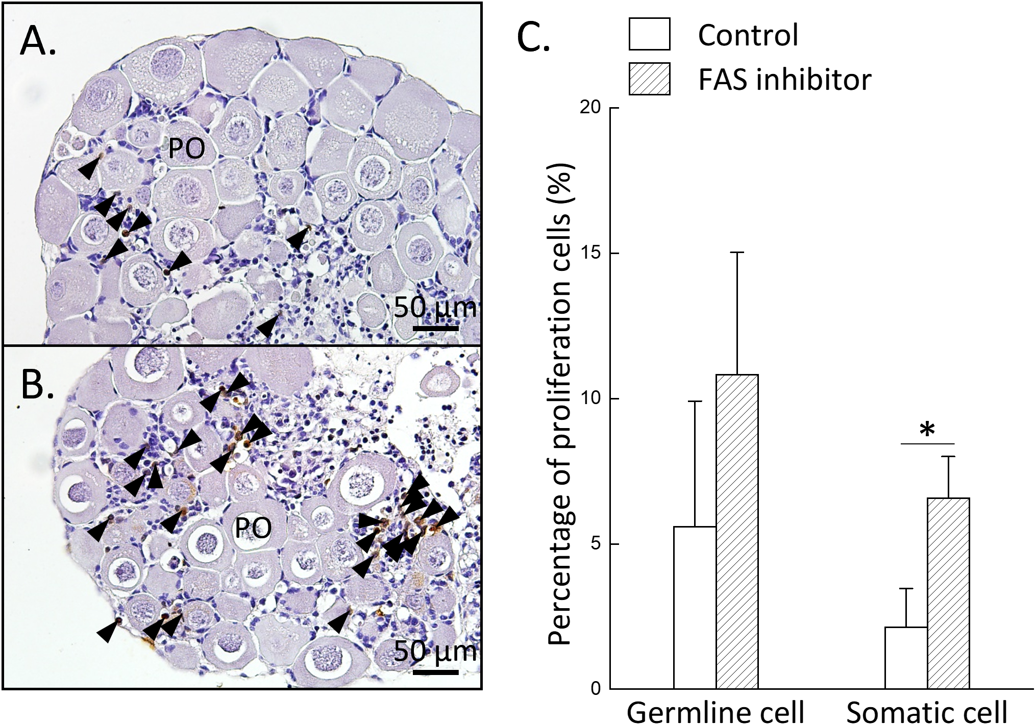 Inhibition of FAS enzymatic activity increases somatic cell proliferation in the ovary. Ovarian tissues were divided into two groups: control and FAS-inhibited group (treated with 20 µM TVB-3166). (A, B) IHC staining of BrdU-incorporated cells in the control (A) and FAS-inhibited (B) groups. (C) Ovarian proliferative activity, evaluated as the relative percentage of BrdU-positive cells in both groups. Black arrowheads indicate BrdU-positive cells. Statistical significance was determined by Student’s t-test: P < 0.05 (*). PO, primary oocyte.