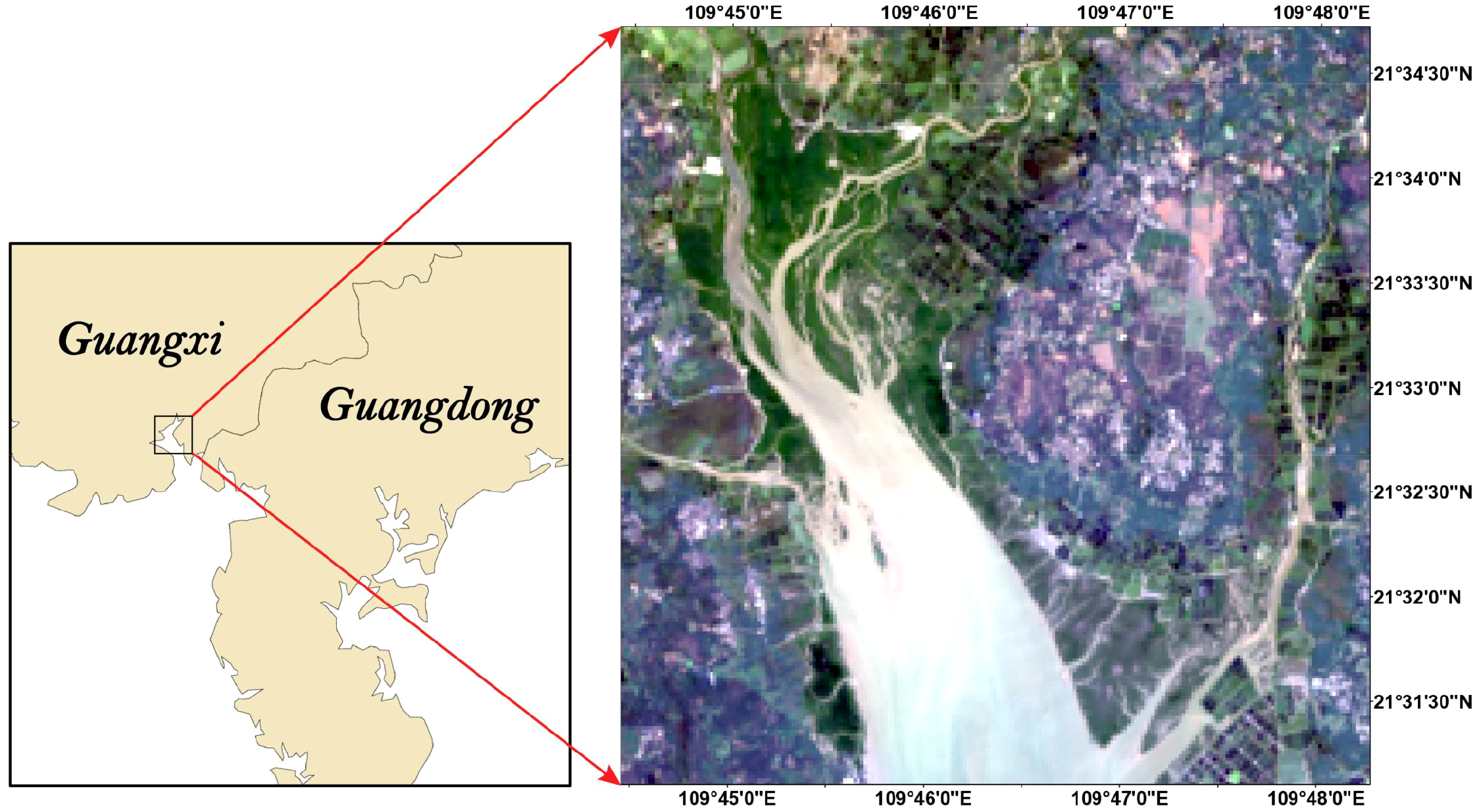This study utilized multi-temporal Landsat surface reflectance products (Level-2) acquired from the United States Geological Survey (USGS) EarthExplorer platform to examine the spatiotemporal dynamics of the Gaoqiao Mangrove National Nature Reserve (21°33’N, 109°44’E), located at the Guangdong–Guangxi border, China, from 1993 to 2023. The dataset consists of Landsat 5 Thematic Mapper (TM, 1993–2012) and Landsat 8 Operational Land Imager (OLI, 2013–2023) images, providing a consistent 30 m spatial resolution. Only the three visible bands (blue, green, red) were used as input to the deep learning models.
