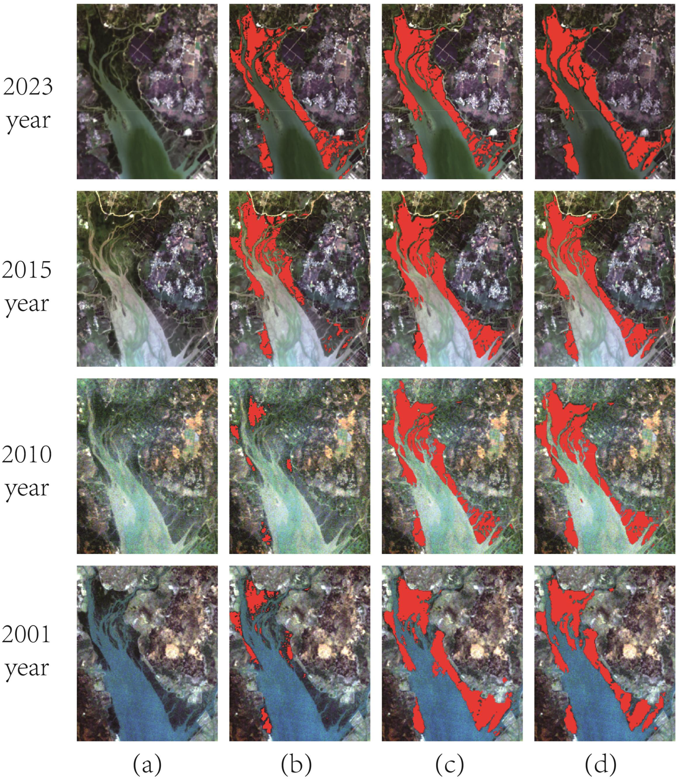 The trained U-Net+SE+CBAM model was applied to all 111 full scenes (1993–2023), producing one binary mangrove mask per year (31 annual masks total). These masks were chronologically divided as follows: