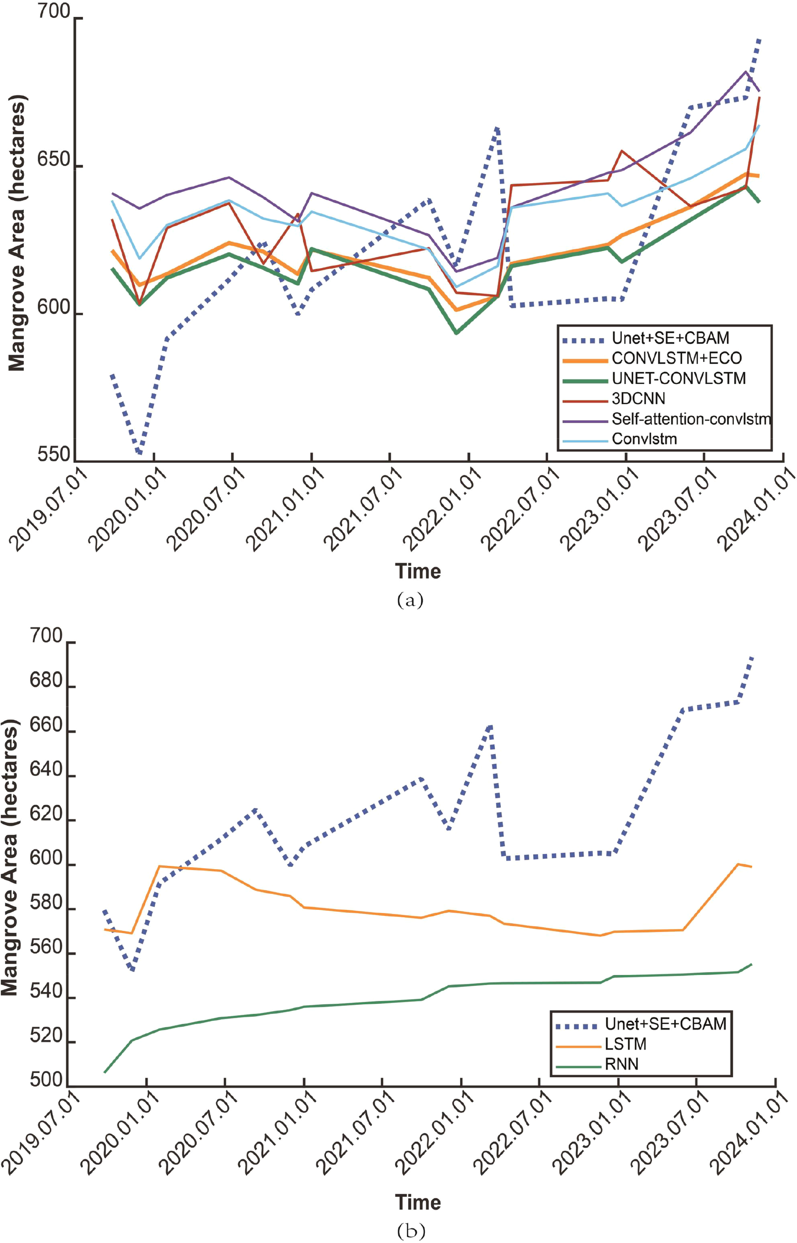 All experiments were implemented in Python using the PyTorch framework on an NVIDIA 4090D GPU with 16 GB memory. The code is available from the corresponding author upon reasonable request. Prediction results were visualized as line graphs of mangrove area (hectares) over time, with the U-Net+SE+CBAM mapping results serving as the reference trajectory.