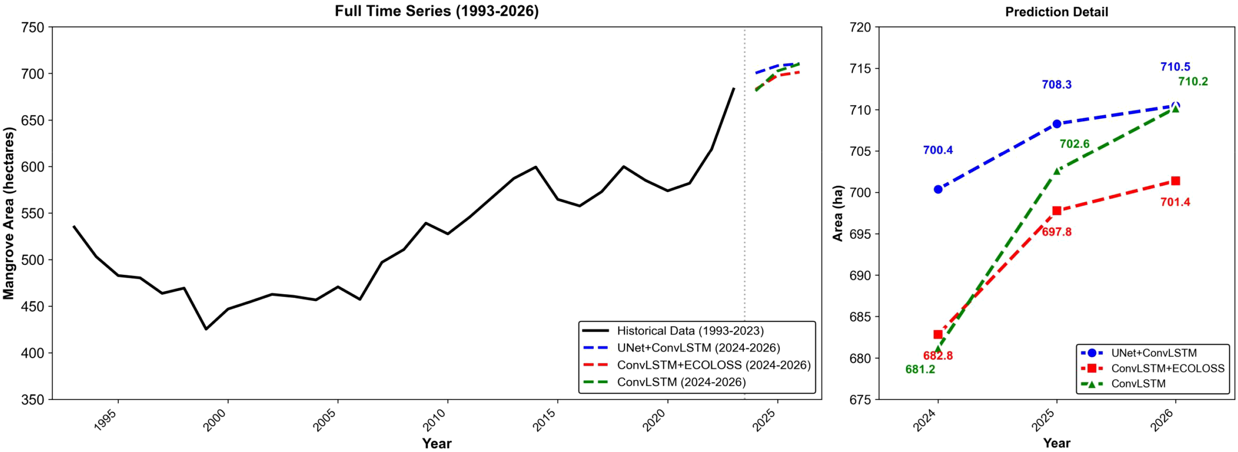 An optional asymmetric Ecological Constraint Loss (ECOLOSS) can be added to form the ConvLSTM+ECOLOSS variant, yielding marginally higher scores (IoU = 0.793, MAE = 6.70%) by constraining extreme growth-rate outliers. Ablation analysis confirms that ECOLOSS provides a modest ecological safeguard against biologically implausible rapid expansion trends but contributes only marginally to short-term forecasting accuracy. Near-term forecasts for 2024–2026 suggest sustained gradual recovery under current management practices, with mangrove extent stabilizing near 700 ha.