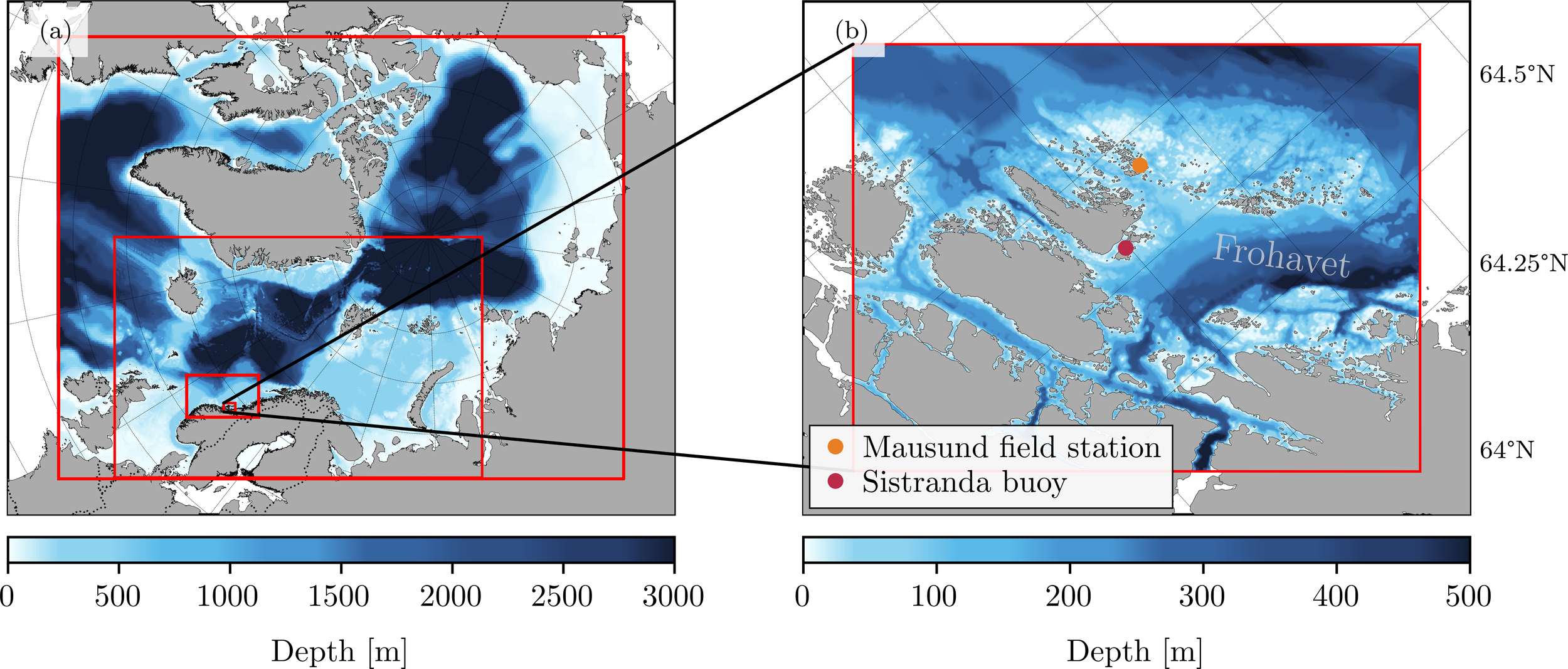 Overlaid bathymetry of (a) the North Atlantic–Arctic region with computational model domains GIN, NOR4KM, MIDNOR, and FROSHELF marked in red, and (b) a closer view of FROSHELF, marked in red, covering the Frohavet field campaign area, with marked locations for the Mausund field station and a research buoy at Sistranda.