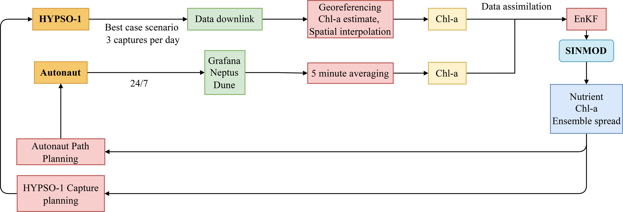 Frohavet, a sea area sheltered by the Froan archipelago along the middle of the Norwegian coast (Figure 1b) was chosen as the experimental location. This region is characterized by shallow bathymetry and a highly productive basin (Fragoso et al., 2024), which supports abundant fishing activities and a burgeoning aquaculture industry. During the spring months, Frohavet typically experiences one or more significant algal blooms, which are highly dynamic both spatially and temporally. Comprehensive monitoring is required to fully capture the growth dynamics of these blooms, making this region an excellent testing ground for the closed-loop approach. Previous field campaigns have been conducted in both Frohavet (April-May 2022 and 2023) (Williamson et al., 2023), and Kongsfjorden (May 2022) in Svalbard, with some of the tested sensors showing adaptive sampling capabilities (Mo-Bjørkelund et al., 2024), albeit with simplified onboard models and not integrated with other observational platforms. In the present experiment, the observation system consists of two platforms: HYPSO-1, a small, agile 6U satellite equipped with a hyperspectral imager providing Chl-a estimates (Bakken et al., 2023), and the AutoNaut, a long-endurance wave-propelled USV equipped with a wide range of scientific sensors for sampling biological and physical properties of the surface waters (Dallolio et al., 2019). The observational platforms are described in detail in Sec. 2.2.1 and Sec. 2.2.2, and their measurements are assimilated into the ocean model using the EnKF framework demonstrated in Halvorsen et al. (2022).