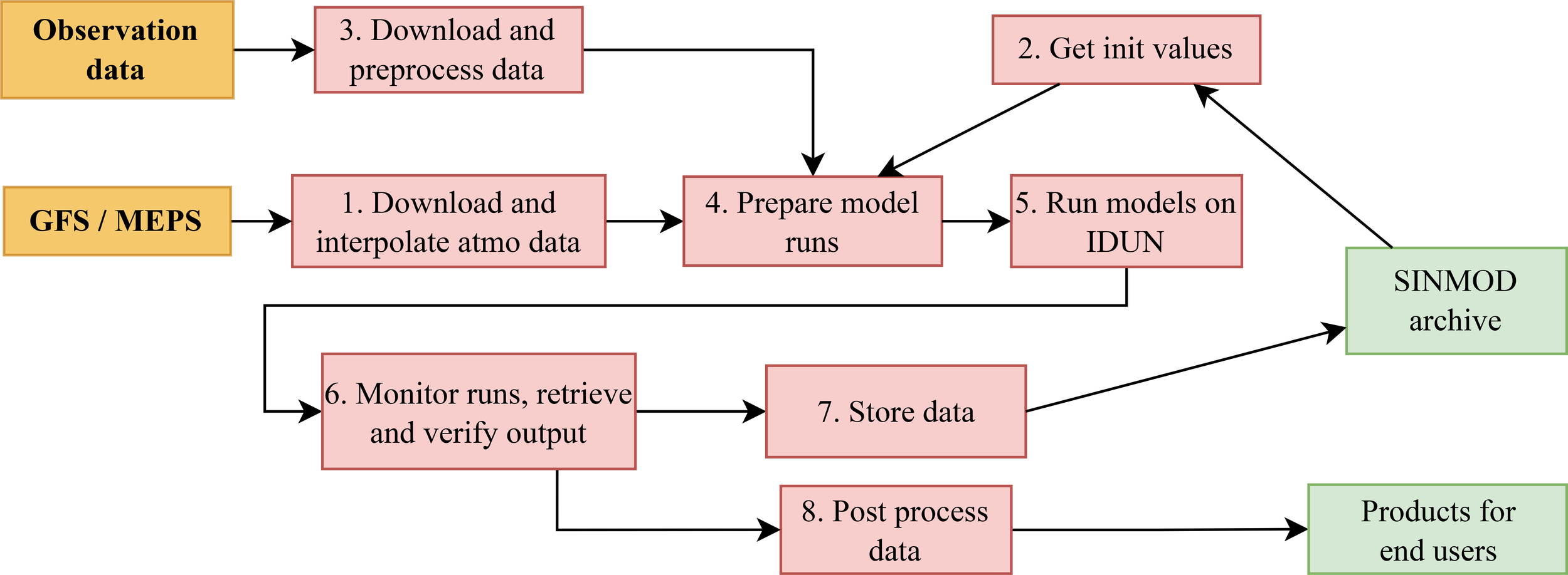 Two different sources of atmospheric data are used. For the large-scale GIN and NOR4KM models, NOAA’s Global Forecast System (GFS)1 was used, which provides global data of 0.25-degree resolution with a 1-hour time resolution at a forecast horizon of 120 hours, and longer forecasts at a 3-hour time resolution. Initial conditions for GFS are provided by the Global Data Assimilation System (GDAS), which runs a 4D hybrid ensemble-variational data assimilation scheme. For the high-resolution MIDNOR and FROSHELF models, the Norwegian Meteorological Institute’s MetCoOp Ensemble Prediction System (MEPS)2 is used, which provides forecasts based on 30 ensemble members run every six hours with lead times out to 61 hours and a spatial grid spacing of 2.5 km. In both cases, data is downloaded in NetCDF format and linearly interpolated into each SINMOD domain’s grid. Atmospheric data is loaded by SINMOD every hour in model time, and linearly interpolated in time to fit the temporal resolution of the simulations.