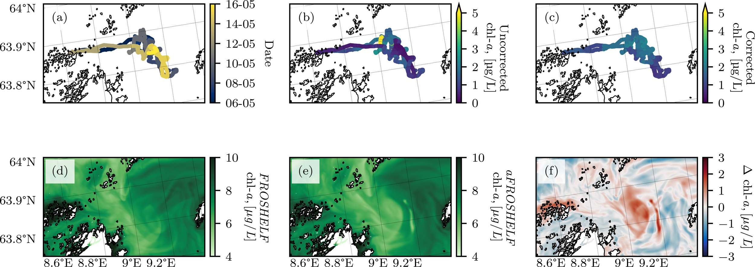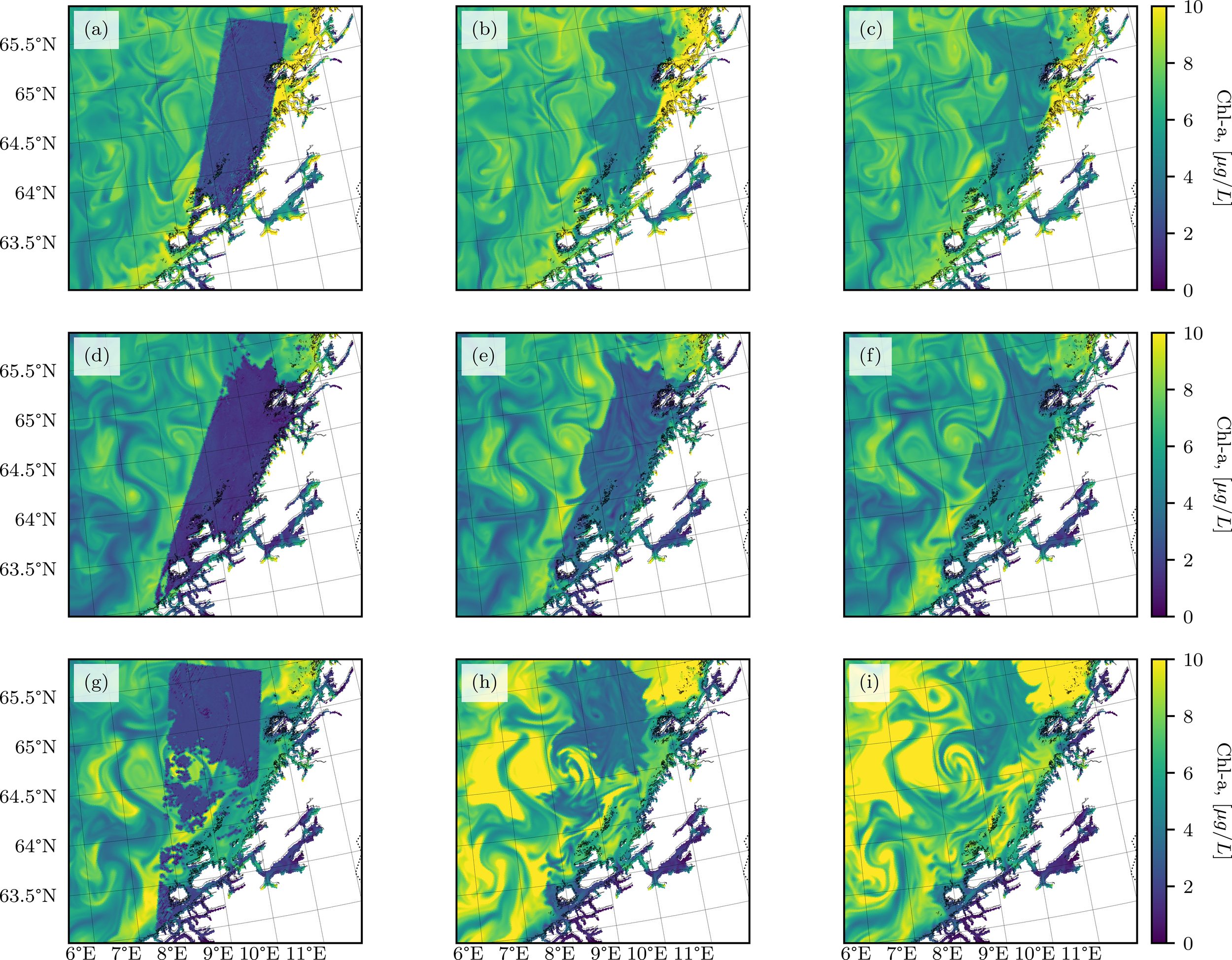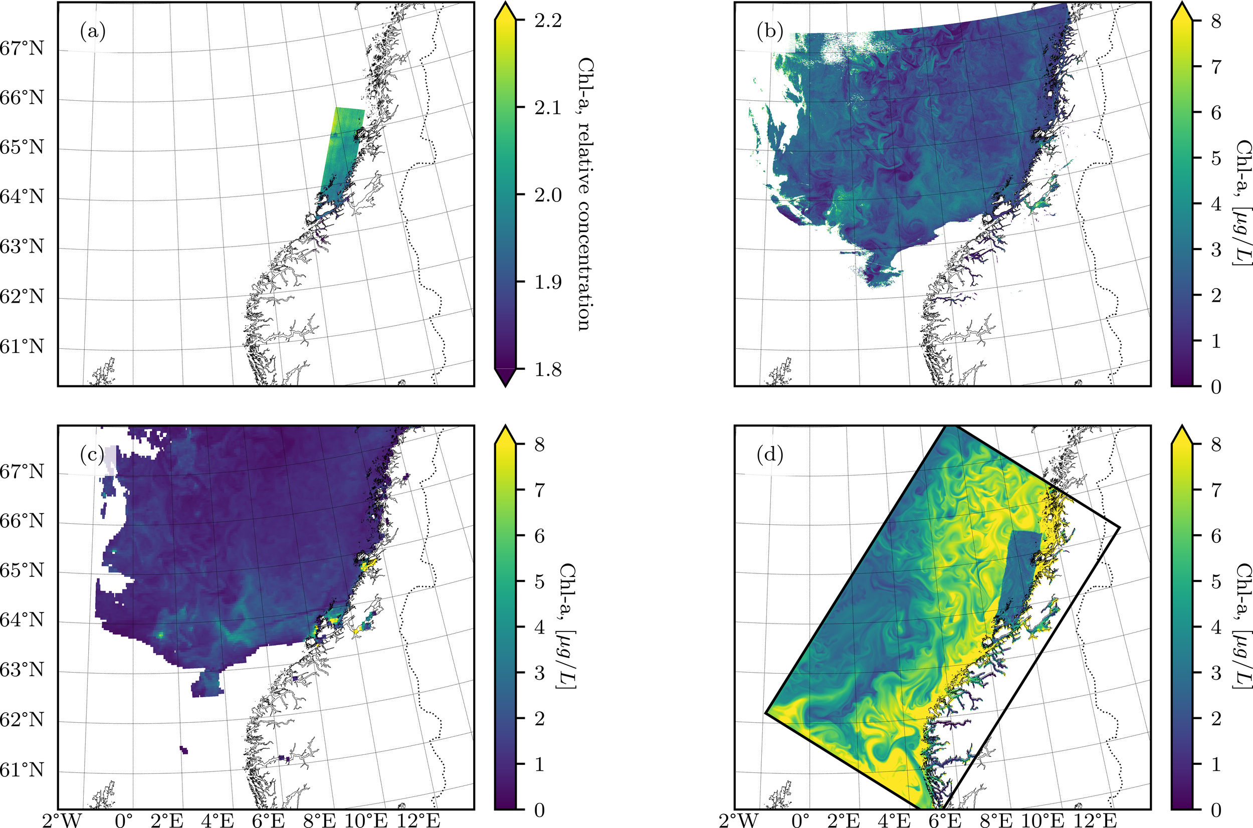 The spring 2024 Frohavet ocean monitoring campaign started on the 2nd of April and concluded on the 21st of May. Bi-weekly meetings were held during the campaign to review data from the different sources in the closed-loop observation system, explained in detail in, 2.2.1 and 2.2.2. Observations were assimilated into the operational SINMOD model using an EnKF (Sections 2.4 and 2.3). The entire operational closed-loop ocean observation system is displayed in Figure 2. Additional data sources were monitored when available, irrespective of whether they were integrated into the closed-loop system. These sources included Chl-a estimates from ESA’s Sentinel-3A and 3B satellites (NASA Goddard Space Flight Center, 2024), NASA’s MODIS (NASA Ocean Biology Processing Group, 2025a) and VIIRS instruments (NASA Ocean Biology Processing Group, 2025b), and a Chl-a sensor installed at 3m depth on a kelp farm buoy about 2 km east of Frøya island (63°44.62’N 8°52.76’E) in the southern Frohavet region, shown in Figure 1b.