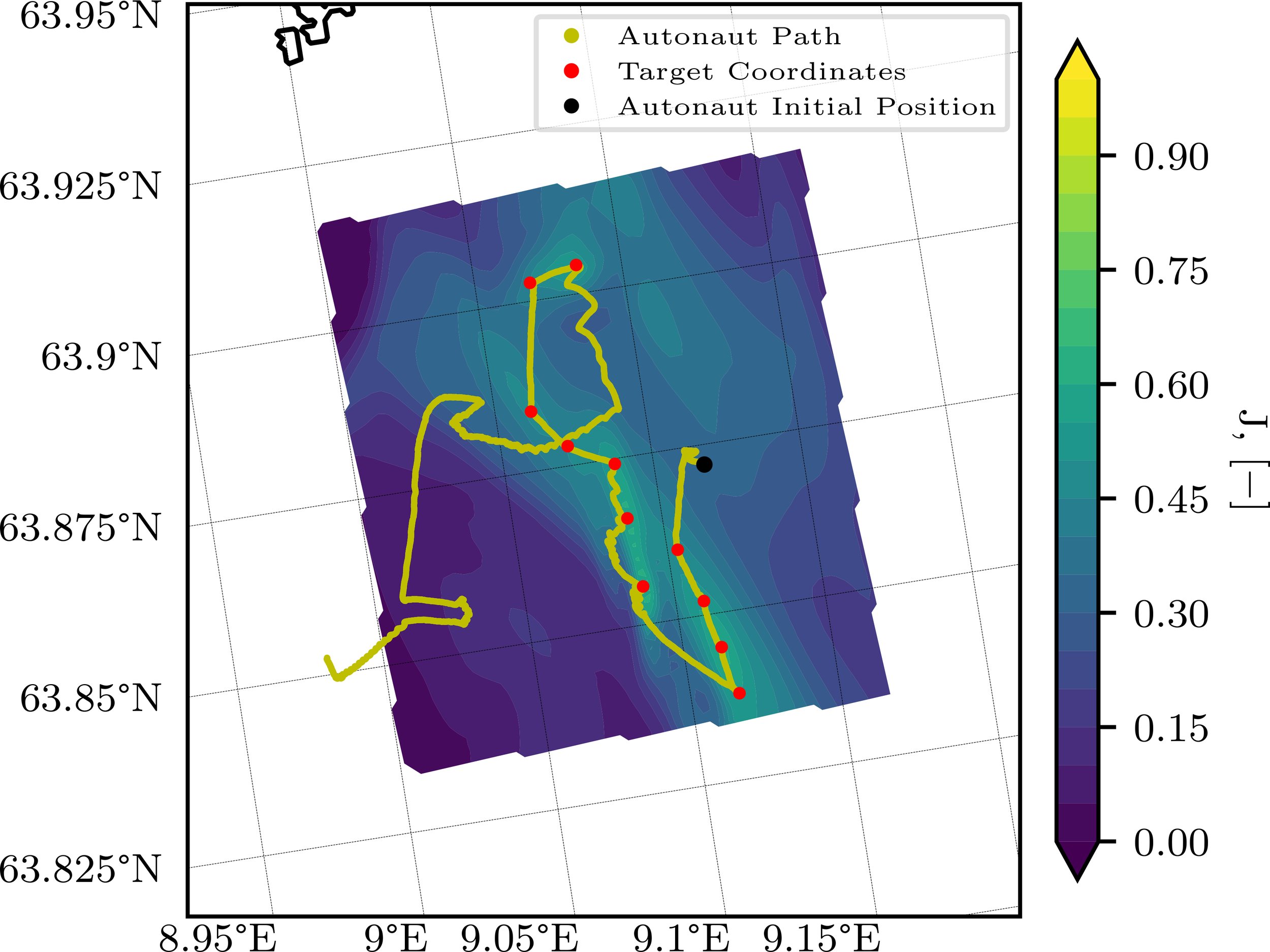 Each fi linearly rescales its parameter to [0, 1] from worst to best. Table 2 lists the normalization formulae and weight sets for early (Case 1) and late (Case 2) mission phases. In the first part of the campaign, nitrates concentration was not considered, as shown for case 1, while it was introduced towards the end of the mission for case 2. The adaptive search was restricted to a designated low-traffic box (63.8333°N - 63.9167°N, 9.0000°E - 9.1667°E). Scores are computed on the FROSHELF grid, where the score field, J, identifies locations of high observational value. The top 11 candidate waypoints are selected iteratively by choosing the grid cell with the highest score, then successively selecting the next highest-scoring cells that are at least 800 m away from any previously chosen point. A travelling-salesman solver then orders these waypoints to minimise the total path length from the USV’s current position (Applegate et al., 2006). The list of coordinates is then sent to the AutoNaut operator, who proceeds with tasking the agent. If the waypoint list was completed before the next planning update, temporary coordinates were sampled uniformly within the predefined operational box until replanning.