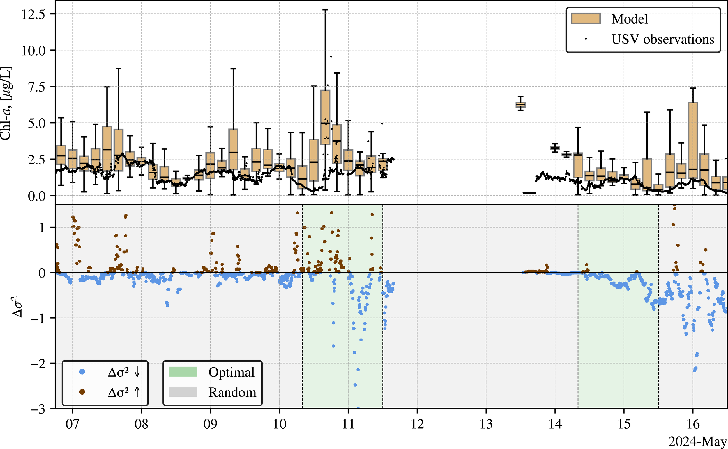 Complementing these system-level efforts, previous work has extensively explored the integration of various observational platforms with open-loop ocean models for optimal path planning. In such systems, information flow is typically unidirectional: either the ocean model informs the observational asset, or the asset corrects the ocean model or other tools to unify heterogeneous ocean observations. For instance, Fossum et al. (2019) embedded an adaptive sampling technique on an AUV using a Gaussian process (GP) to map and track subsurface Chl-a maxima; and Berget et al. (2018), Berget et al., 2022, Berget et al., 2023) demonstrated adaptive tracking of suspended material plumes using an onboard stochastic spatio-temporal proxy model initialised with data from the same complex model used in this paper. Ford et al. (2022) further present a closed-loop experiment with one glider, guided by a stochastic predictor and assimilated into a pseudo-operational setup.