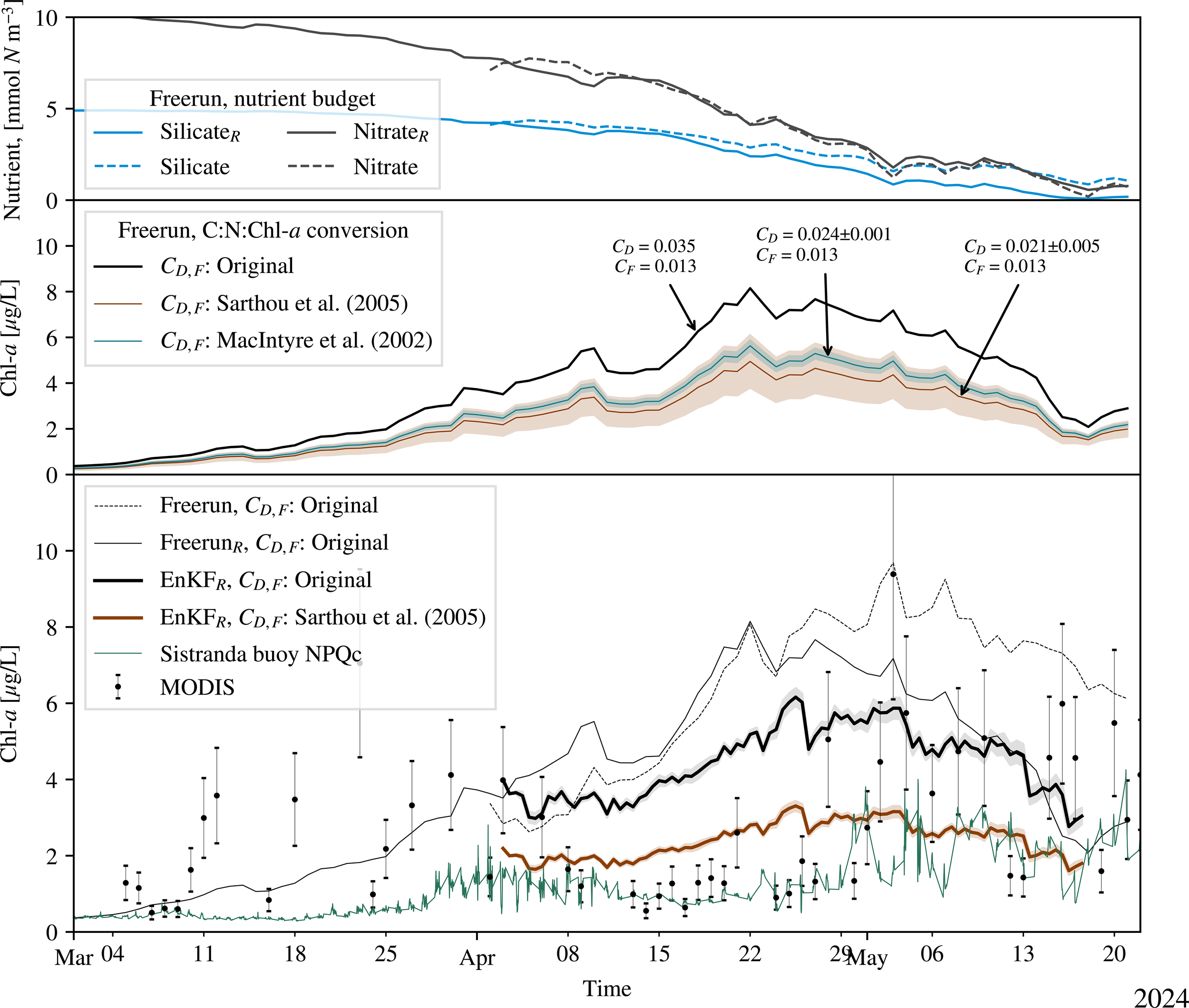 where is the atomic ratio of carbon and nitrogen in marine phytoplankton, slightly enriched in carbon compared to the canonical Redfield ratio of (Redfield et al., 1963; Frigstad et al., 2014). MC = 12.01 g/mol is the molar mass of carbon. Fixed carbon-to-Chl-a ratios for diatoms and flagellates ( and ) were used, which are known to vary with environmental conditions such as light availability, temperature, and nutrient concentrations (Druon et al., 2010; Jakobsen and Markager, 2016; Yu et al., 2020; Smyth et al., 2023). A post-campaign sensitivity analysis was conducted to evaluate how variations in these conversion factors influence Chl-a estimates. Empirical values from the literature (MacIntyre et al., 2002; Sarthou et al., 2005; Lacour et al., 2017) informed the selection of a plausible range for CD (0.02–0.035) and CF (0.01–0.013).