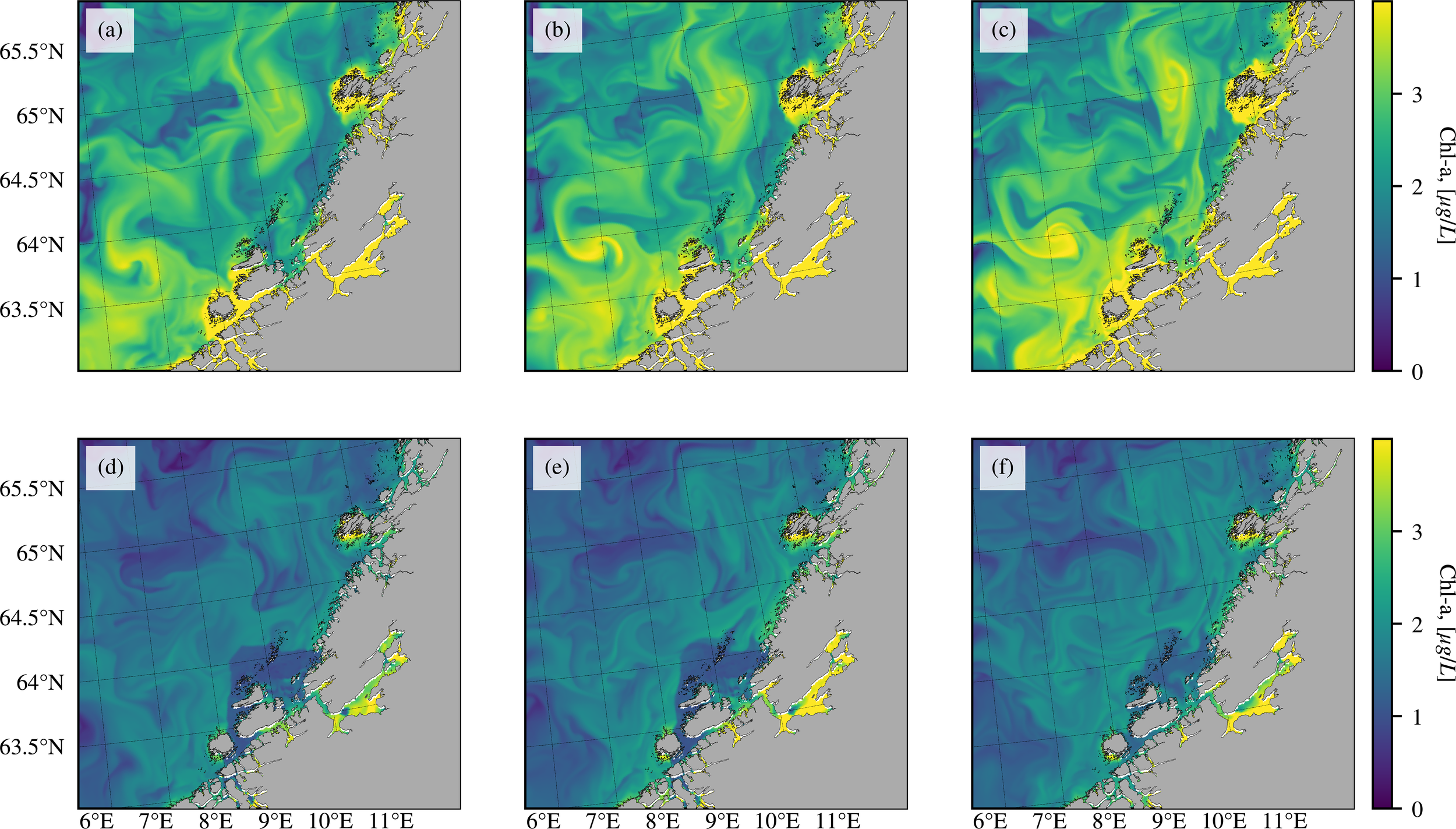 The model used in this study is the coupled physical-chemical-biological ocean model SINMOD (Slagstad and McClimans, 2005; Wassmann et al., 2006), developed and maintained by SINTEF Ocean in Trondheim, Norway. With nearly 40 years of continuous refinement, SINMOD is designed to be a flexible research tool that allows efficient integration of new modelling strategies and configurations. SINMOD operates in a nested setup, where computational domains covering larger spatial scales are run at lower spatial and temporal resolutions, providing boundary conditions for smaller, higher-resolution domains. This approach follows the flow relaxation scheme of Martinsen and Engedahl (1987). The streamlined design of SINMOD, combined with its adaptability, enables the rapid testing of novel configurations and data assimilation methods, as applied in this study.