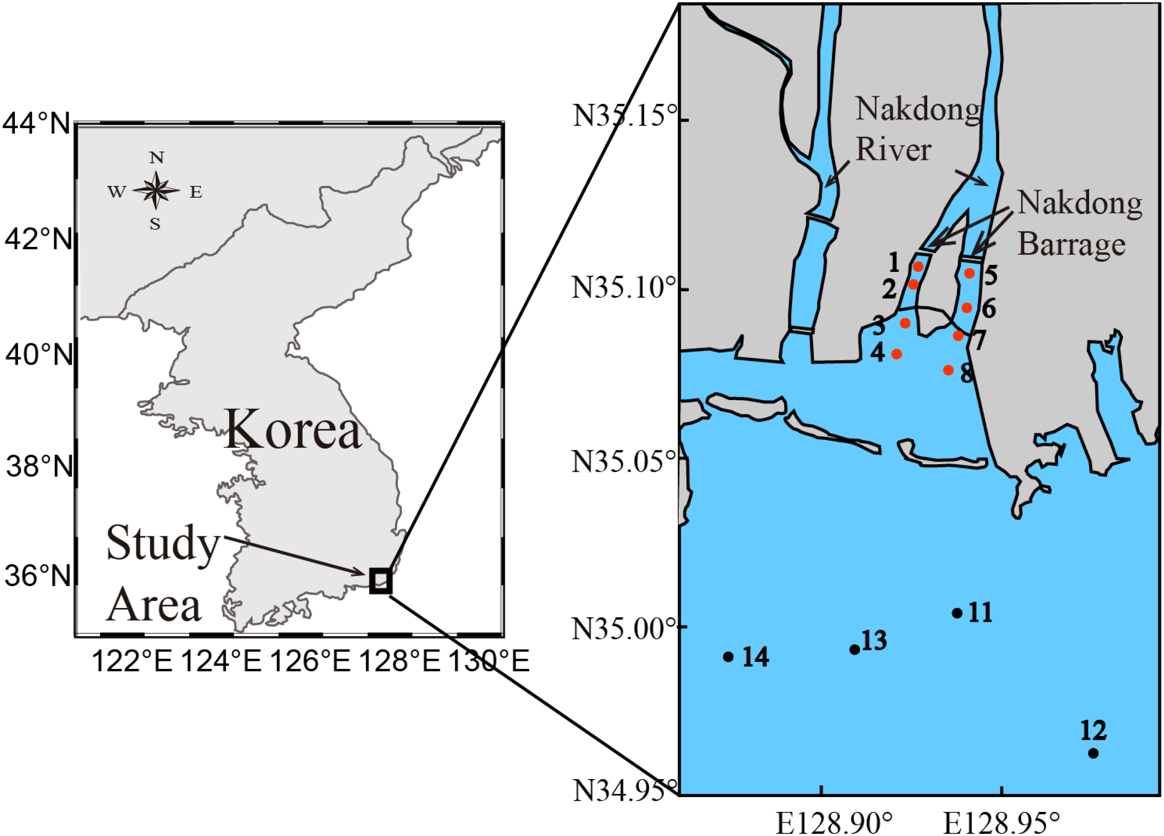 A map showing estuarine (station 1–8; red circles) and offshore (station 11–14; black circles) water sampling stations in Nakdong River Estuary, South Korea.