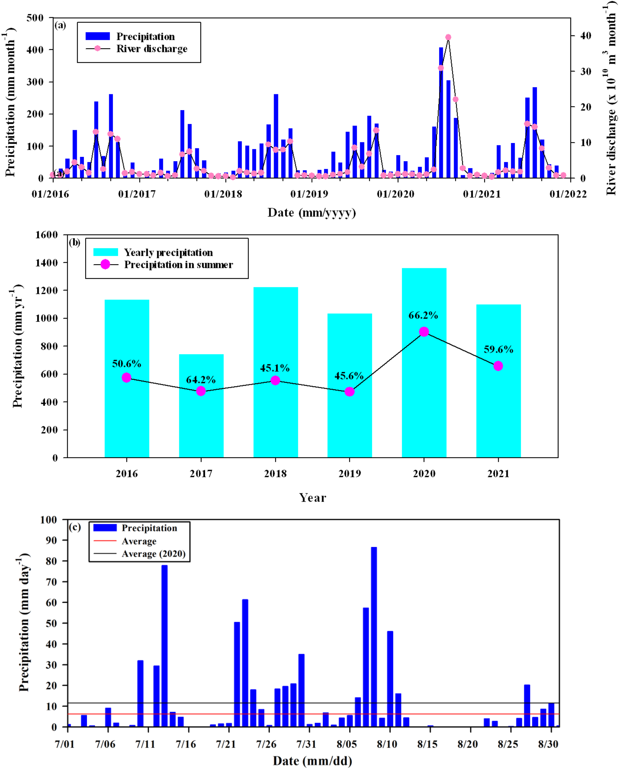 (a) Monthly precipitation and river discharge variation from 2016 to 2021. (b) Yearly precipitation (bar) and precipitation in each summer season (from July to September) (pink circle) between 2016 and 2021. The number represents the proportion of summer precipitation to the annual total. (c) Daily precipitation from July to August 2020 (blue bar) and the average daily precipitation for the same period in 2020 (black line) and 2016, 2017, 2018, 2019, and 2021 (red line).
