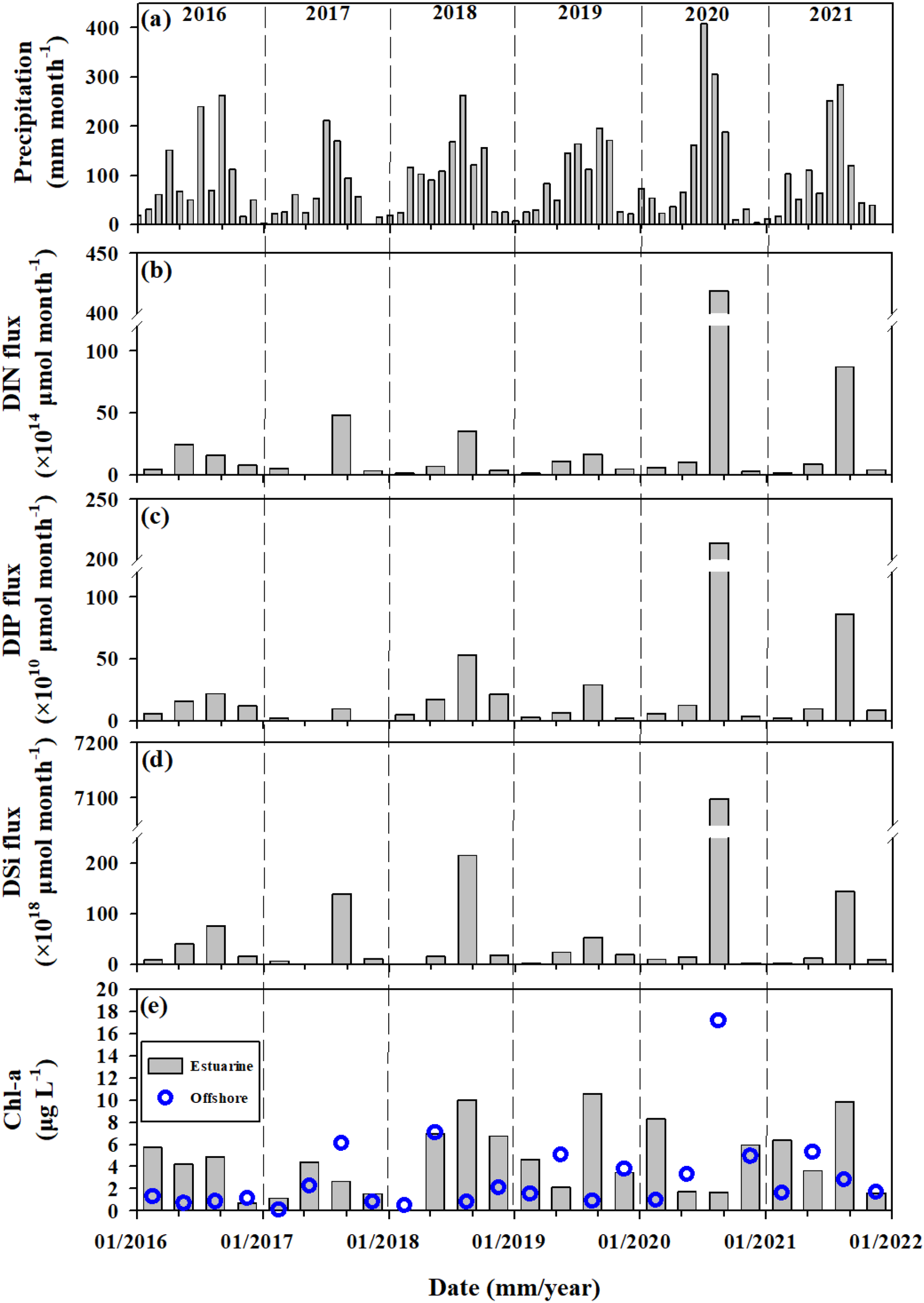 Temporal variation of (a) monthly precipitation and river water–derived fluxes of (b) DIN, (c) DIP, (d) DSi in February, May, August, November from 2016 to 2021. (e) average concentrations of Chl-a in estuarine (station 1–8; box plots) and offshore (station 11–14; blue circles) waters.