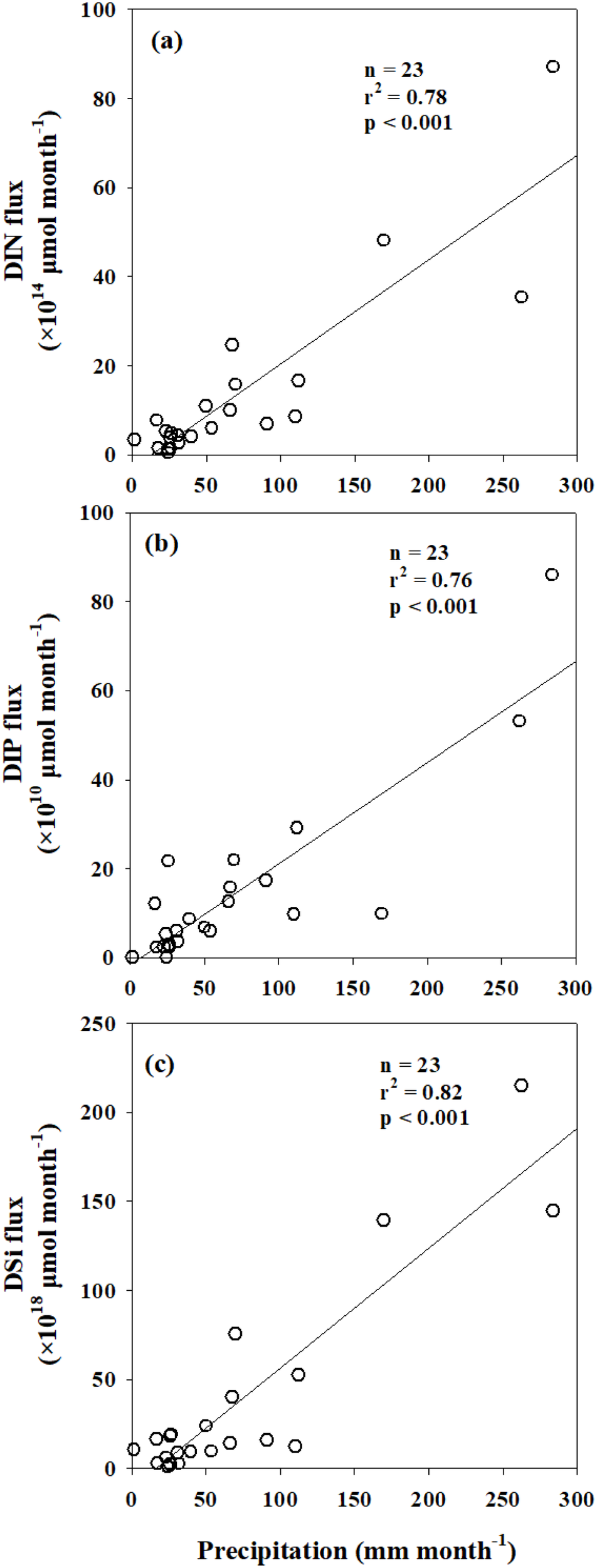 Correlations between precipitation and (a) DIN flux, (b) DIP flux, and (c) DSi flux. The solid lines represent the regression lines.