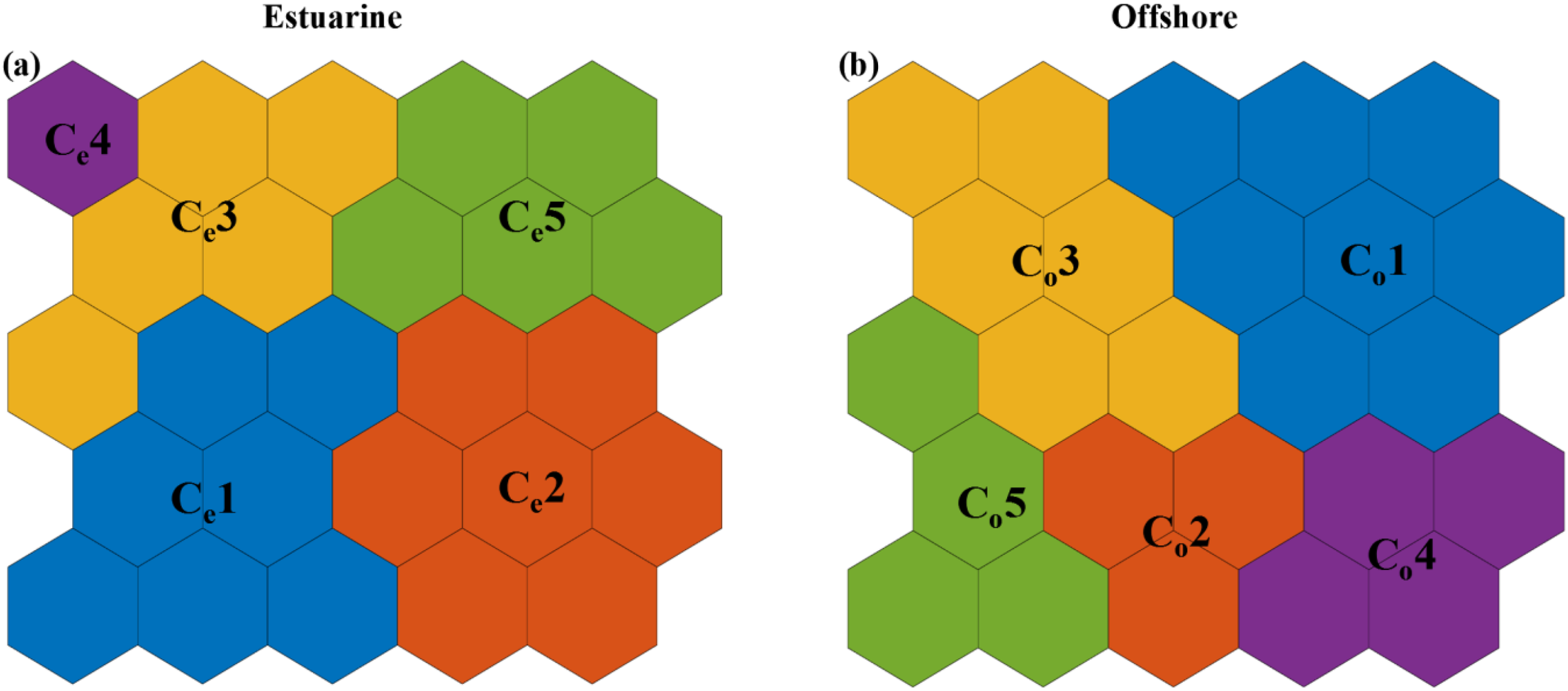 SOM clustering results for (a) estuarine and (b) offshore water quality. Each hexagon represents a SOM neuron, and the colors indicate the clusters (Ce1–Ce5 and Co1–Co5).