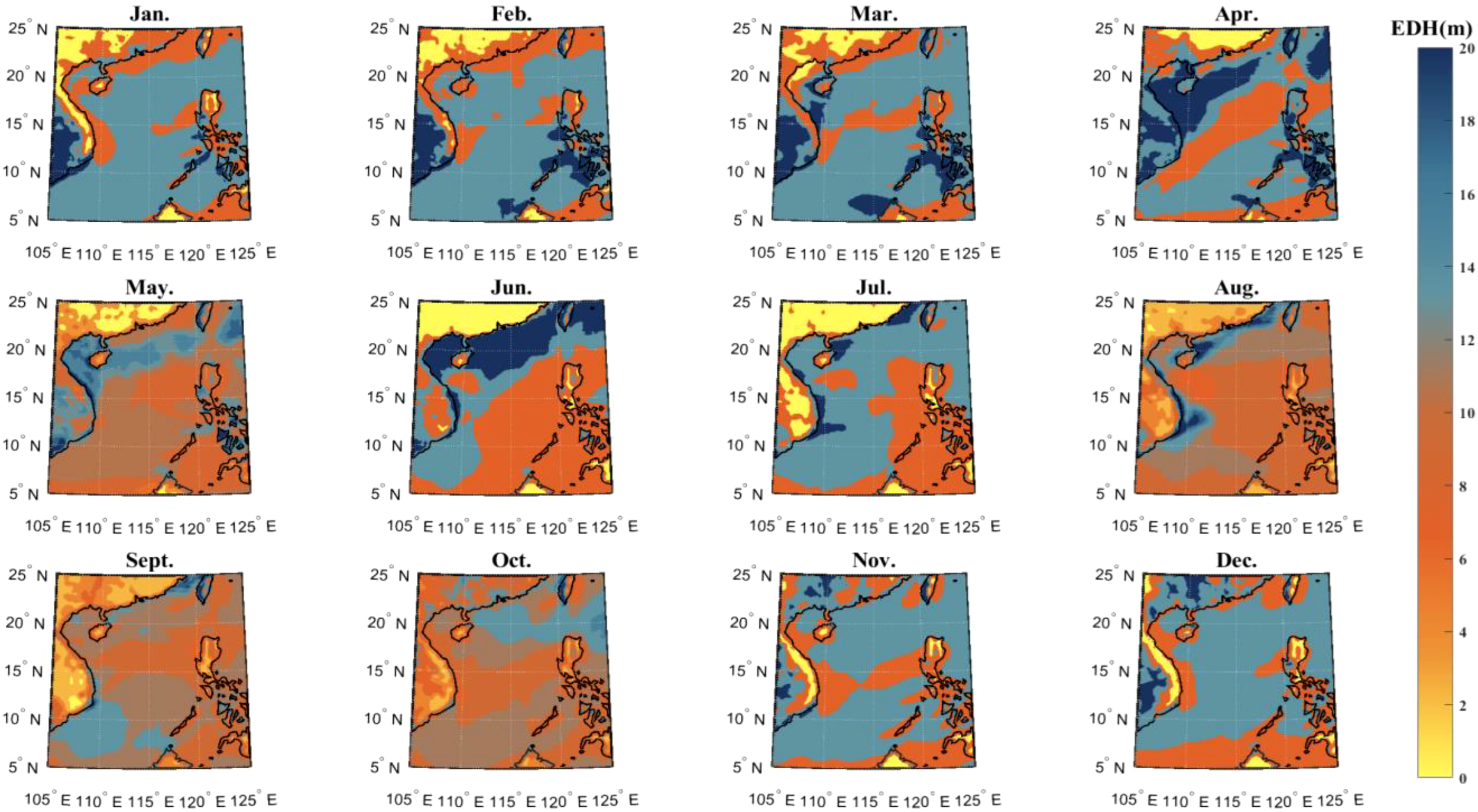Height map of annual evaporation duct occurrence in the South China Sea.