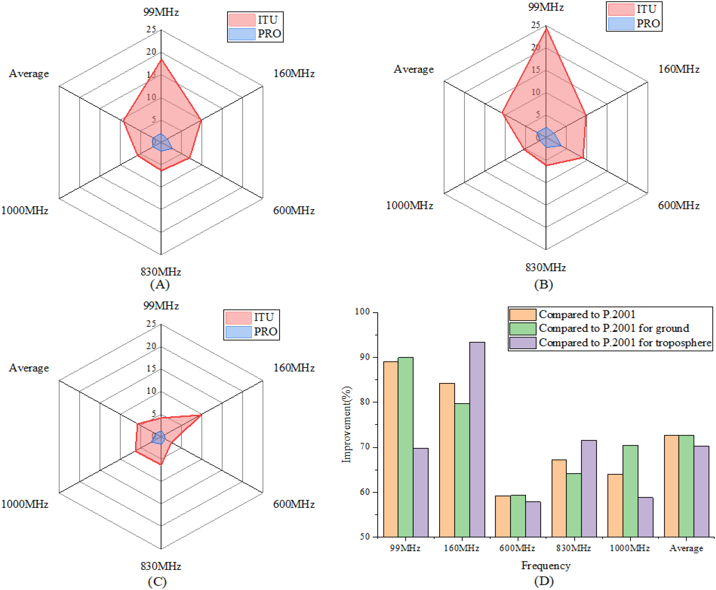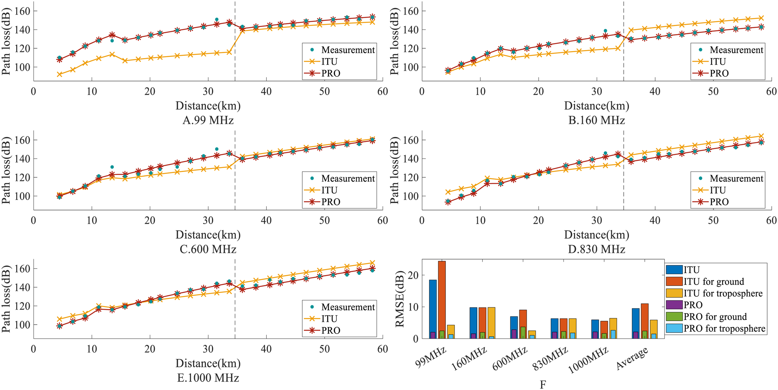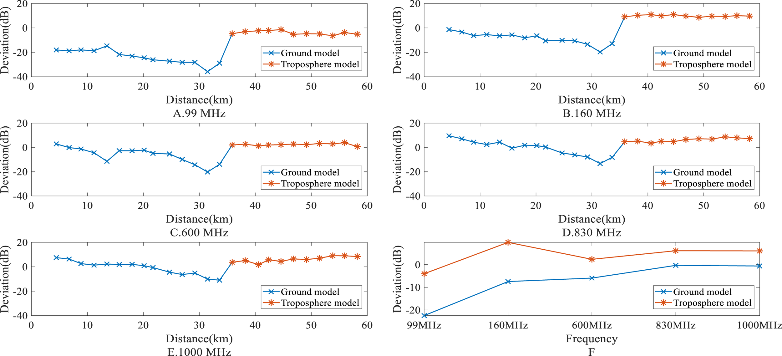 The deviation between the ITU model’s prediction and the measurement. (A) The deviation at 99MHz. (B) The deviation at 160MHz. (C) The deviation at 600MHz. (D) The deviation at 830MHz. (E) The deviation at 1000MHz. (F) Deviation comparison across different frequencies.