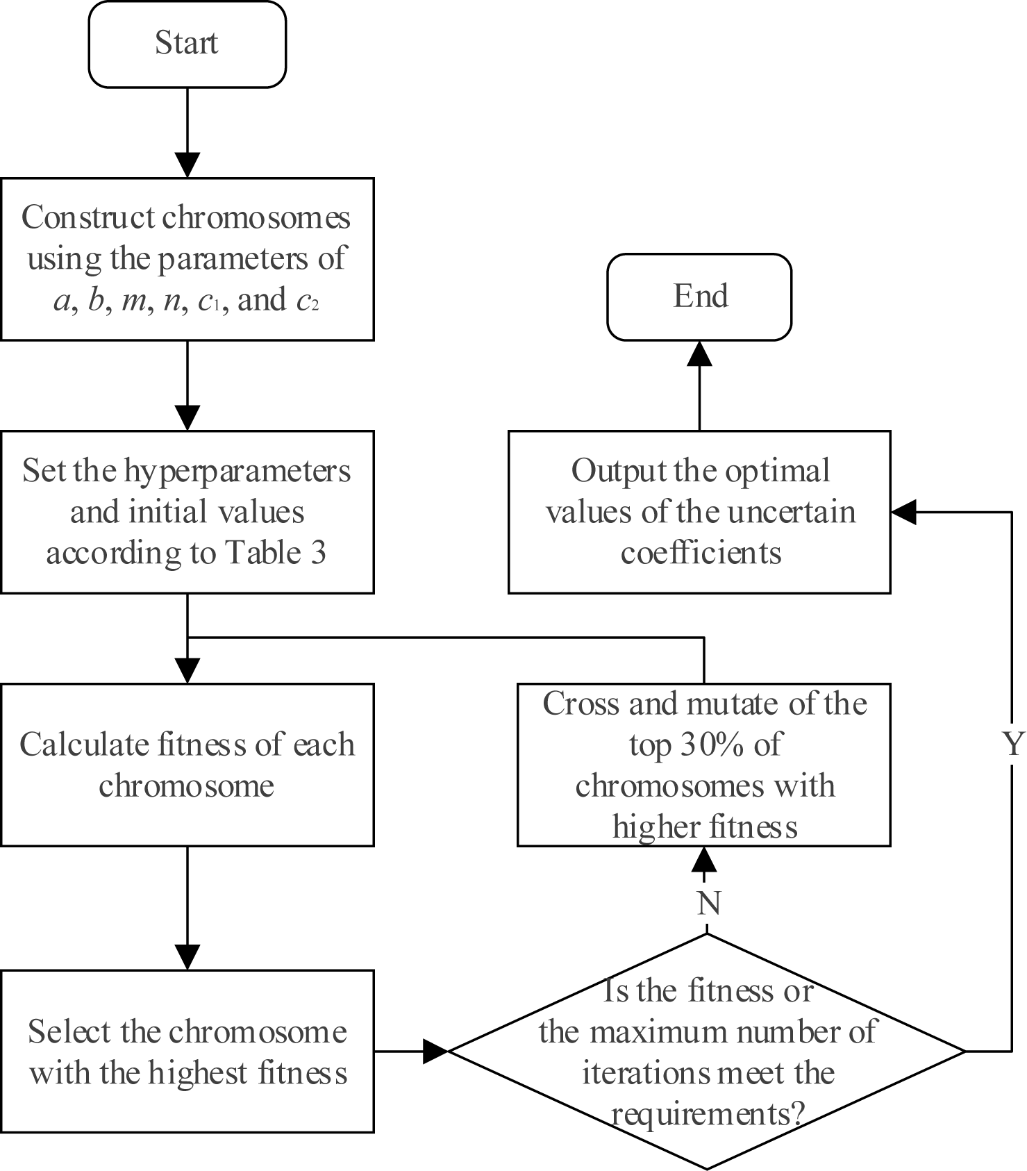 The algorithm then evaluates whether the stopping criteria—defined by either the maximum number of iterations or the convergence of fitness—are satisfied. If the criteria are met, the chromosome with the highest fitness is selected, and the corresponding parameter values are adopted as the final coefficients of the proposed model. Otherwise, the top 30% of chromosomes with higher fitness are preserved for crossover and mutation operations, while the remaining 70% of the population is regenerated within the predefined parameter bounds. This process is iteratively repeated until the termination condition is fulfilled.