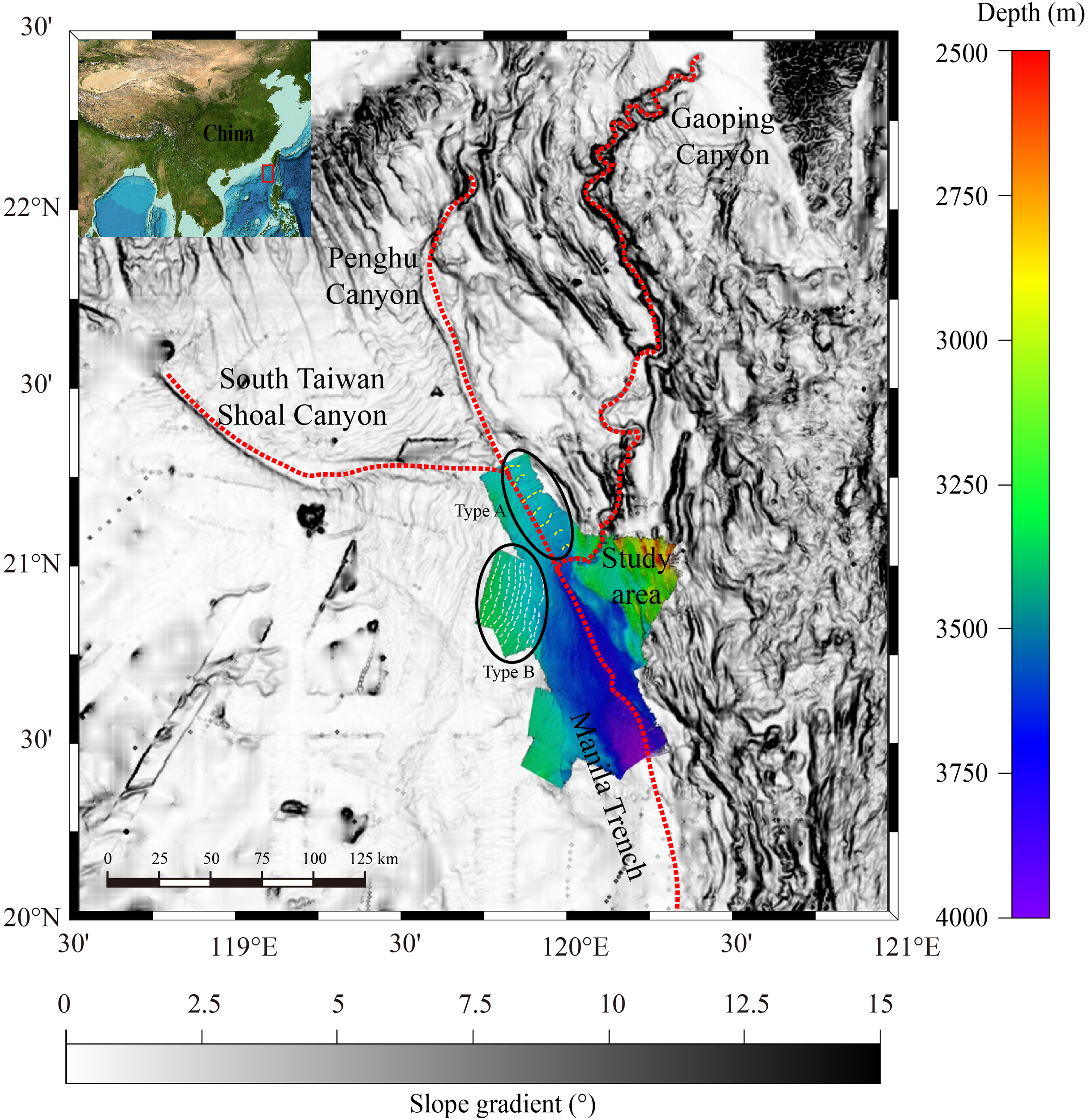High-resolution multibeam bathymetric map of the study area. The bottom map is slope gradient of the study area within the northeast South China Sea (https://download.gebco.net/) and the red dotted lines represent the canyons and trench axis. The two black oval areas represent the location of the Types A and B cyclic steps (Figure 3).
