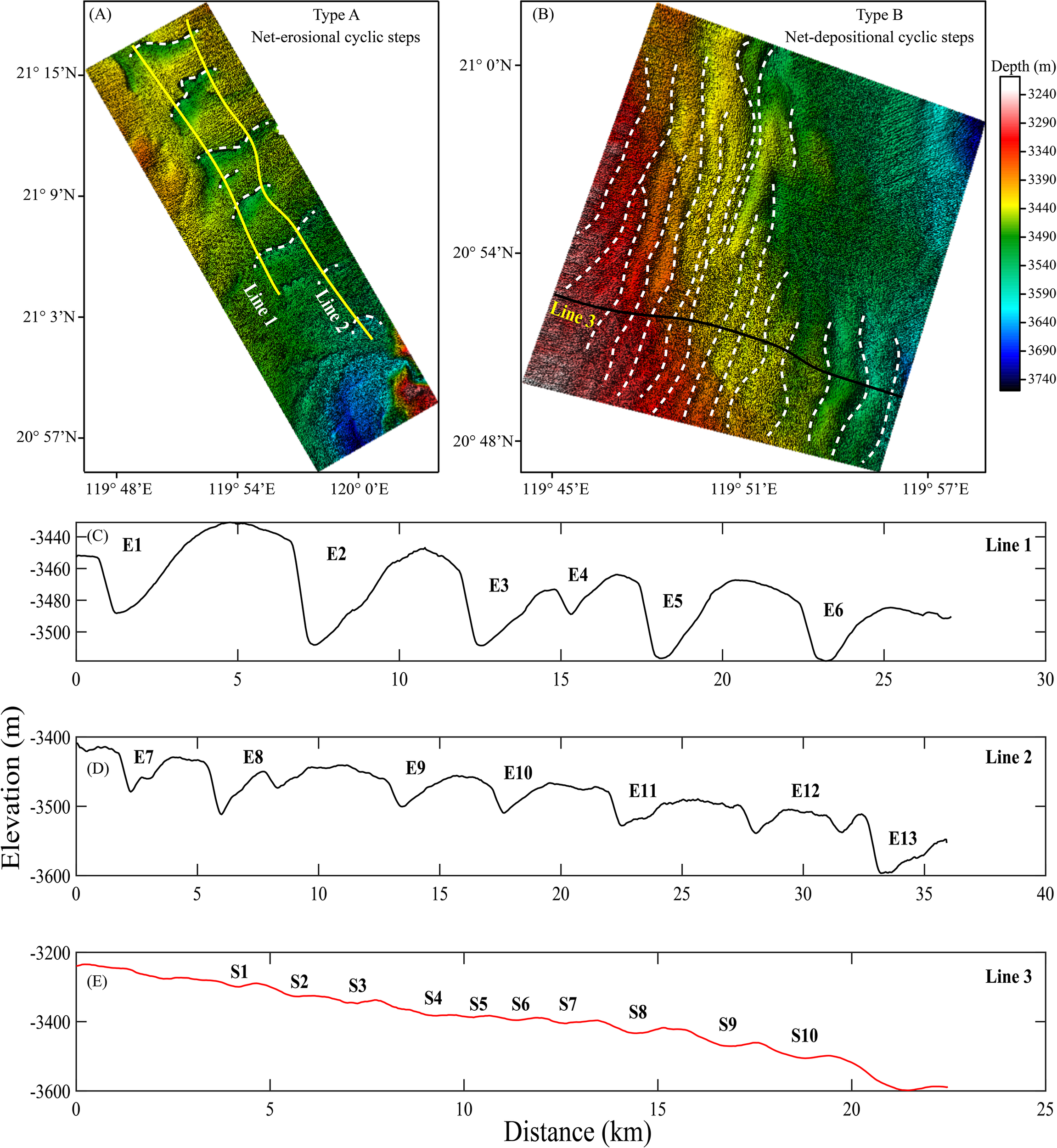 (A, B) Multibeam bathymetric map illustrating the morphology and distribution of cyclic steps. Two yellow lines (Line 1 and Line 2) are the depth profiles of Type A cyclic steps (E1-E6 and E7-E13) in (C, D), which almost parallel in distribution. Black line (Line 3) is the profile of Type B cyclic steps (S1-S10).