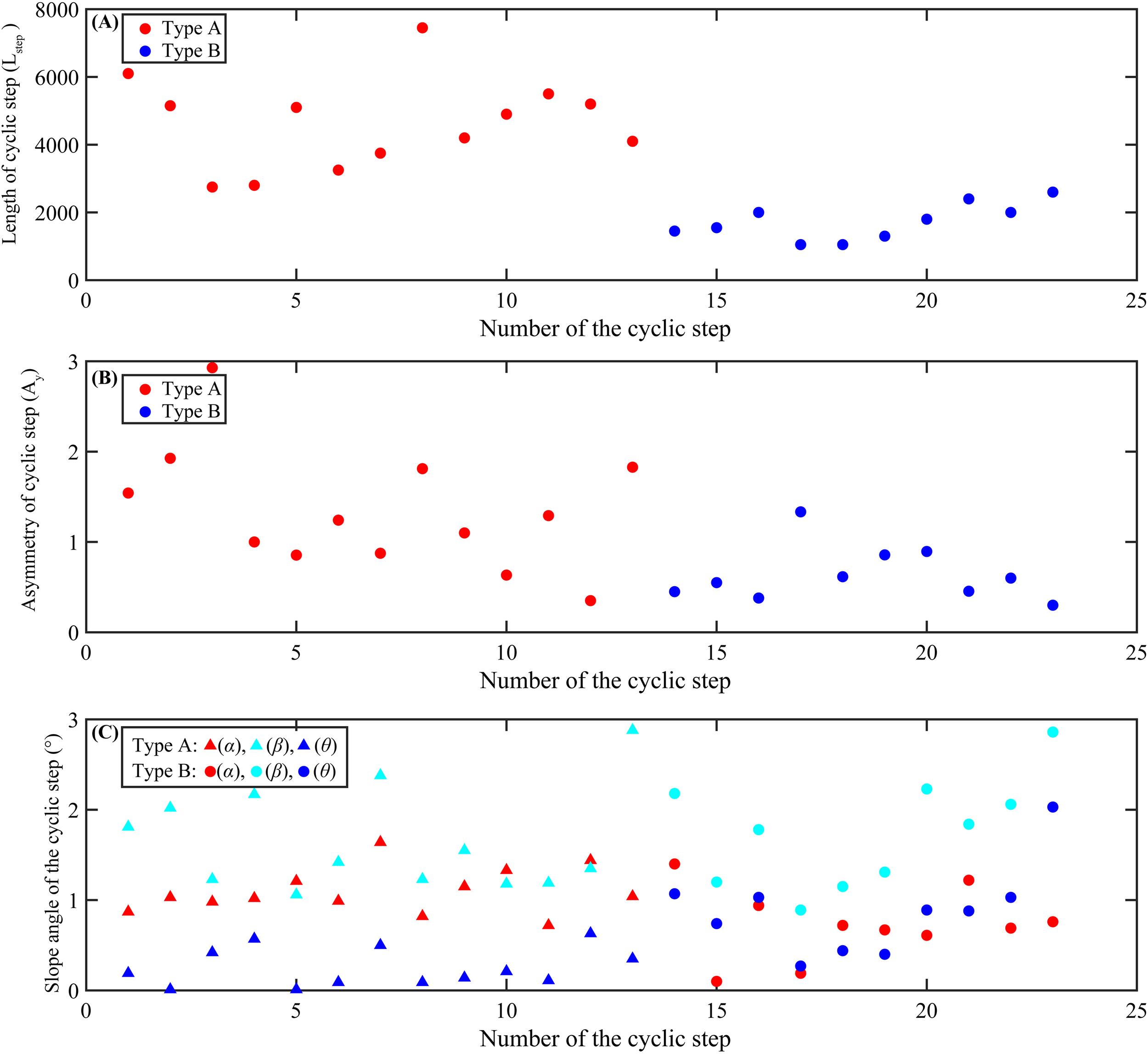 Graphical plots of the morphological characteristics of cyclic steps. (A) Length of cyclic steps comparison between Type A (marked in red) and Type B (marked in blue). (B) Asymmetry of cyclic steps comparison between Type A (marked in red) and Type B (marked in blue). (C) Slope angle of cyclic steps comparison between Type A and Type B. Slope gradients of the stoss side (α), the lee side (β) and the scour (θ) are marked in red, azure and blue, respectively. Note that the triangles represent Type A cyclic steps and the circles indicate Type B cyclic steps in Figure 4C.