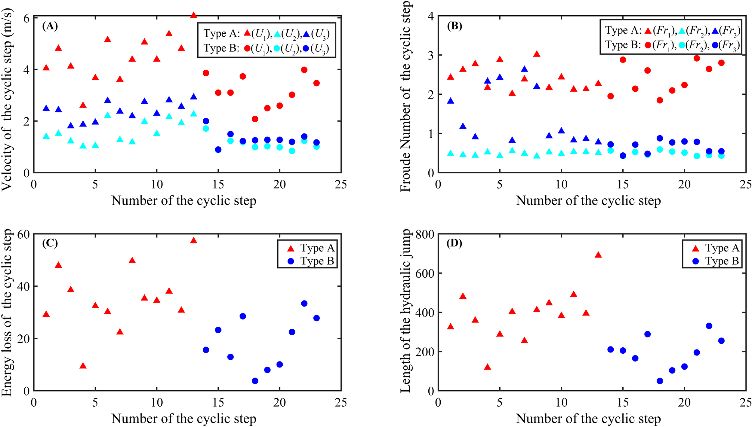 | Type A | Values | U 1 | h 1 | Fr 1 | U 2 | h 2 | Fr 2 | ΔEL | L jump | U 3 | h 3 | Fr 3 |