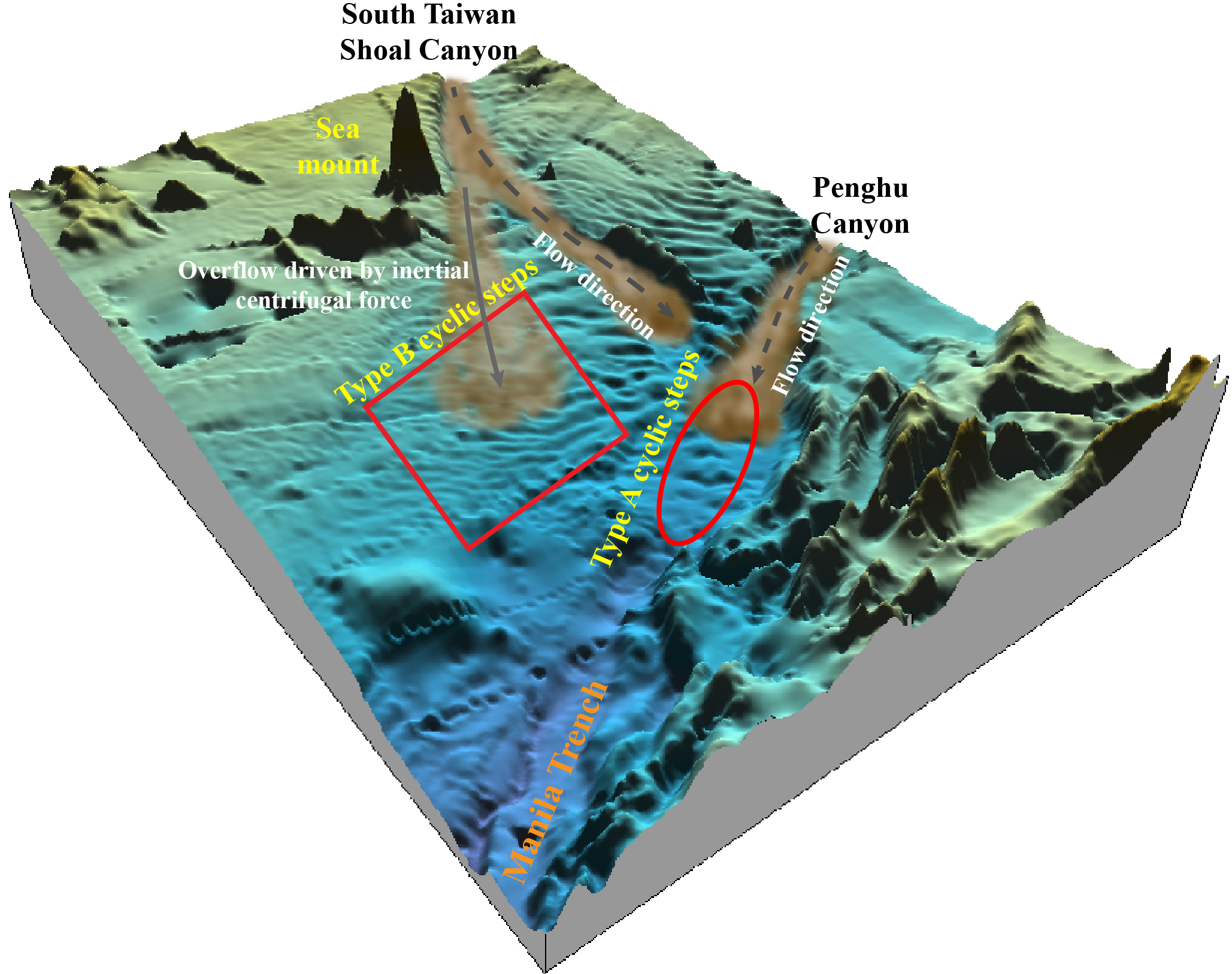 In this study, two types of cyclic steps were identified downstream of the South Taiwan Shoal Canyon and the adjacent Penghu Canyon near the Manila Trench. These were designated as Types A and B cyclic steps, and their characteristics were quantified using high-resolution multibeam bathymetry to address three key objectives: (1) investigating the morphological and geometric parameters of cyclic steps in the vicinity of the Manila Trench; (2) determining the flow properties of turbidity currents traversing these cyclic steps; and (3) identifying the formation processes of different cyclic step types and the factors controlling their morphology.