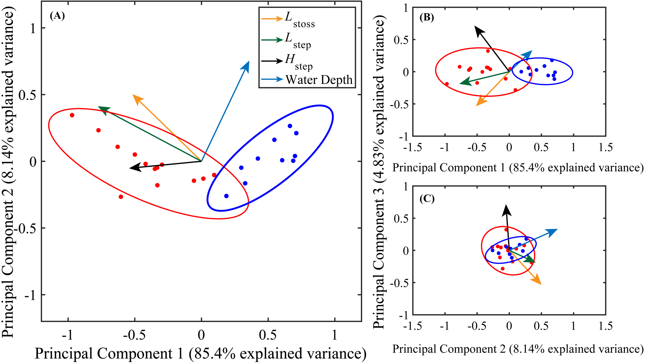 Principal component analysis (PCA) is one of the statistical analysis methods used to identify the variables that best explain the variance in a dataset (Jolliffe, 2014). In this study, we applied the PCA method to determine the key controlling parameters for the dimensional characteristics of the two cyclic step types (Types A and B). Additionally, we analyzed the correlations between the variables and the principal components, with the aim of clarifying which variables should be prioritized for subsequent in-depth analysis.