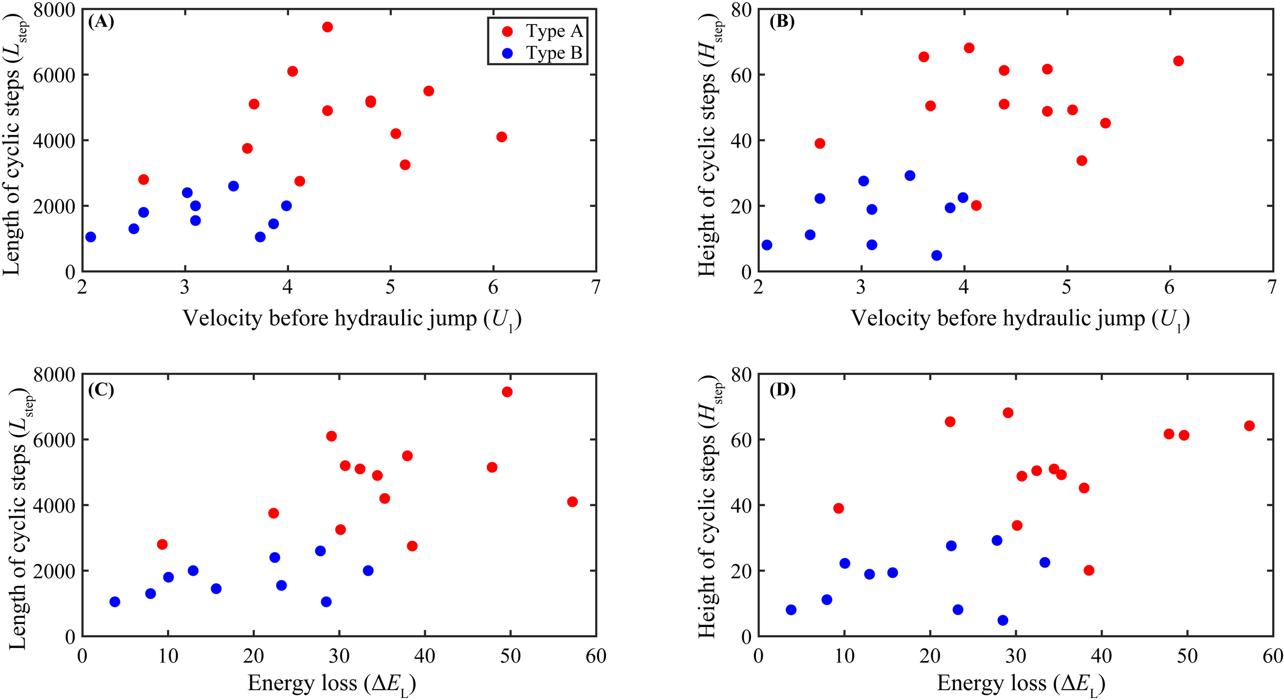 The average wavelength of Type A cyclic steps is 2.7 times that of Type B cyclic steps, and their average wave height is 2.9 times greater (Tables 1, 2). In terms of side lengths: the average stoss side length (Lstoss) of Type A is 4.1 times that of Type B, while the average lee side length (Llee) of Type A is 1.9 times that of Type B (Tables 1, 2). Regarding slope gradients: the average stoss side slope (α) of Type A is 1.5 times that of Type B. In contrast, the average lee side slope (β) and the overall slope (θ) of Type A are 0.94 times and 0.29 times those of Type B, respectively (Tables 1, 2). In terms of morphological indices: the average asymmetry index (Ay) of Type A is 2.1 times that of Type B, whereas the average aspect ratio of Type A is 0.8 times that of Type B (Tables 1, 2).