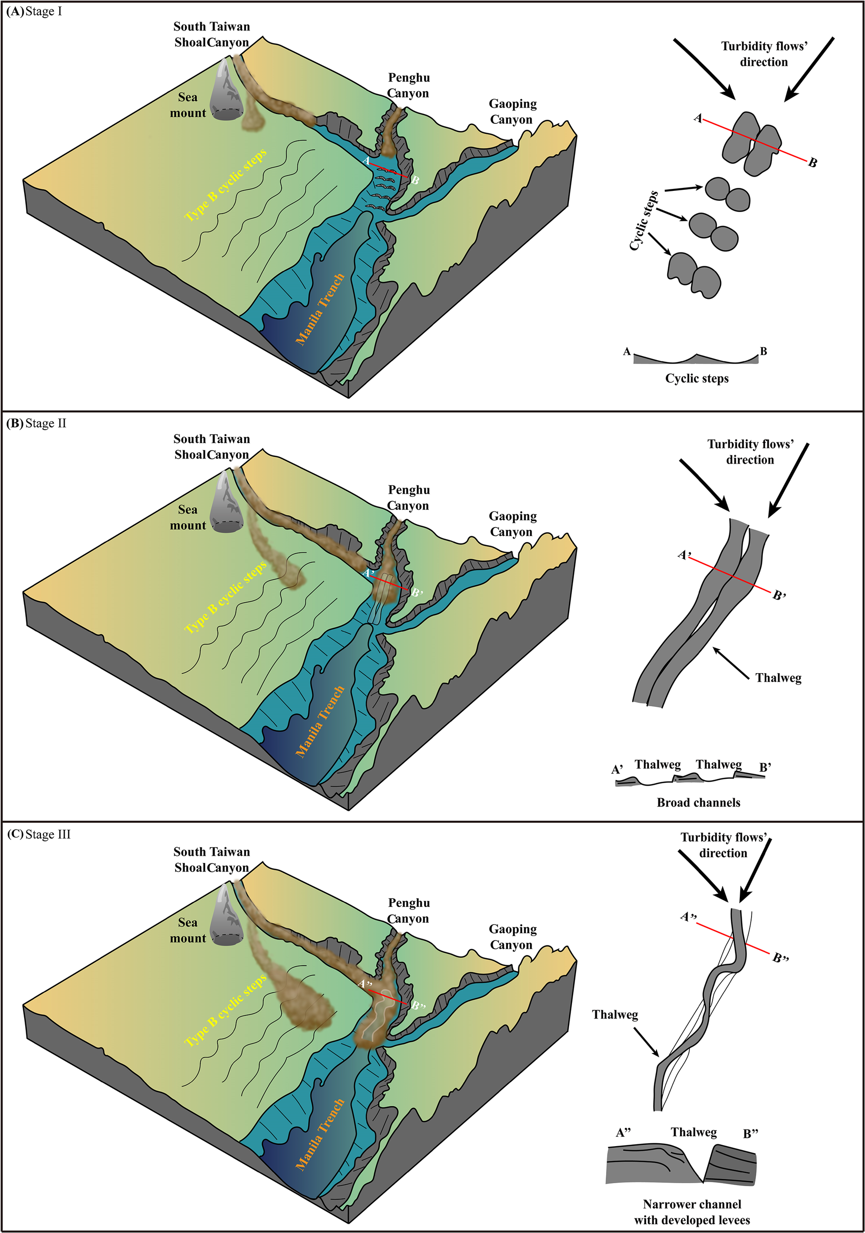 Some cyclic steps distributed in the South Taiwan Shoal Canyon and the West Penghu Canyon in the South China Sea have been reported and investigated (Kuang et al., 2014; Zhong et al., 2015). However, the detailed morphological characteristics of the cyclic steps downstream of these canyons remain enigmatic, and the flow properties of the turbidity currents that generate the cyclic steps downstream of the canyon mouths are still poorly understood.