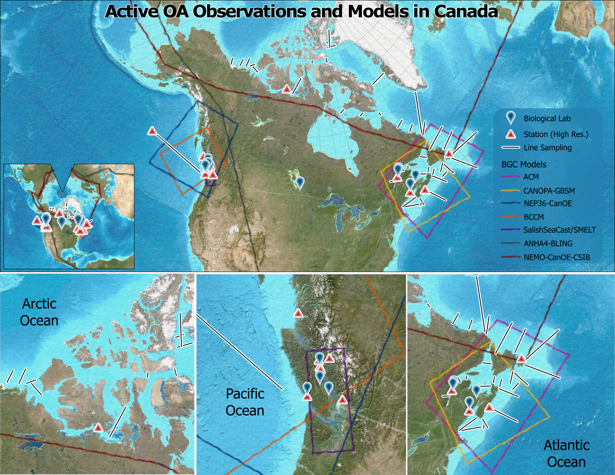 Map of Canada’s OA research assets, including biological labs, cruise lines and moorings, and biogeochemical model domains. This figure only contains active, Canada-based OA resources at the time of publication. A dynamic version of this map will be regularly updated, and is available at https://arcg.is/nWnTa0. The online version of the map also includes inactive/past assets and US-based assets in Canadian waters, as well as links to relevant citations/webpages.