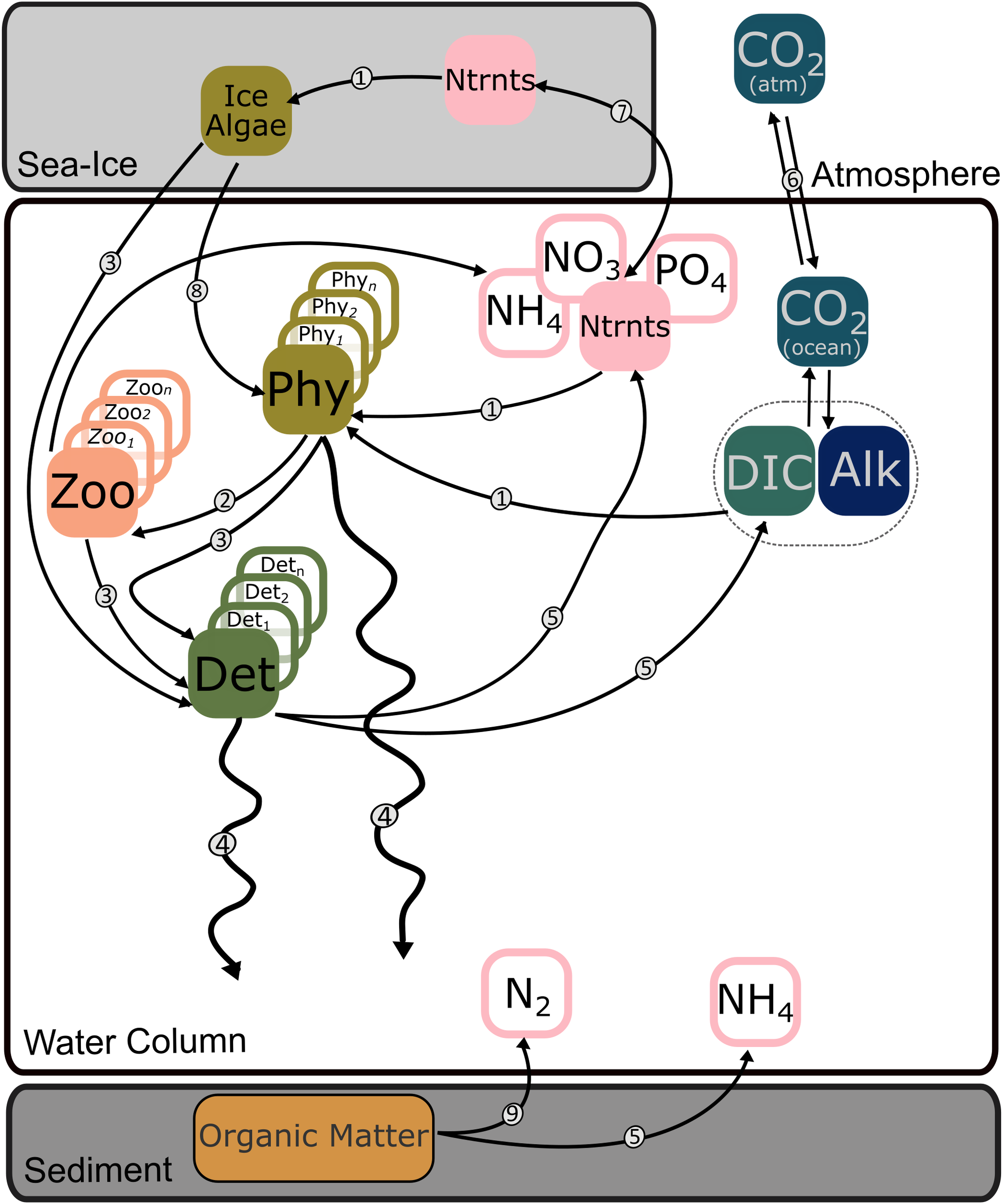 Generic schematic of a simplified biogeochemical model including sea-ice. Squares represent model variables; circled numbers indicate modelled processes. Potential variables included are various nutrients (Ntrnts), DIC, alkalinity (Alk), one or more phytoplankton (Phy) groups, one or more zooplankton (Zoo) groups, one or more size classes of detritus (Det), and ice algae. Processes included are: 1 – nutrient and DIC uptake; 2 – grazing; 3 – mortality; 4 – sinking; 5 – remineralization; 6 – air-sea gas exchange; 7 –mixing and upwelling; 8 – seeding of ice algae; 9 – denitrification. Abiotic effects of sea ice formation on DIC and alkalinity (Mortenson et al., 2020) are not represented.