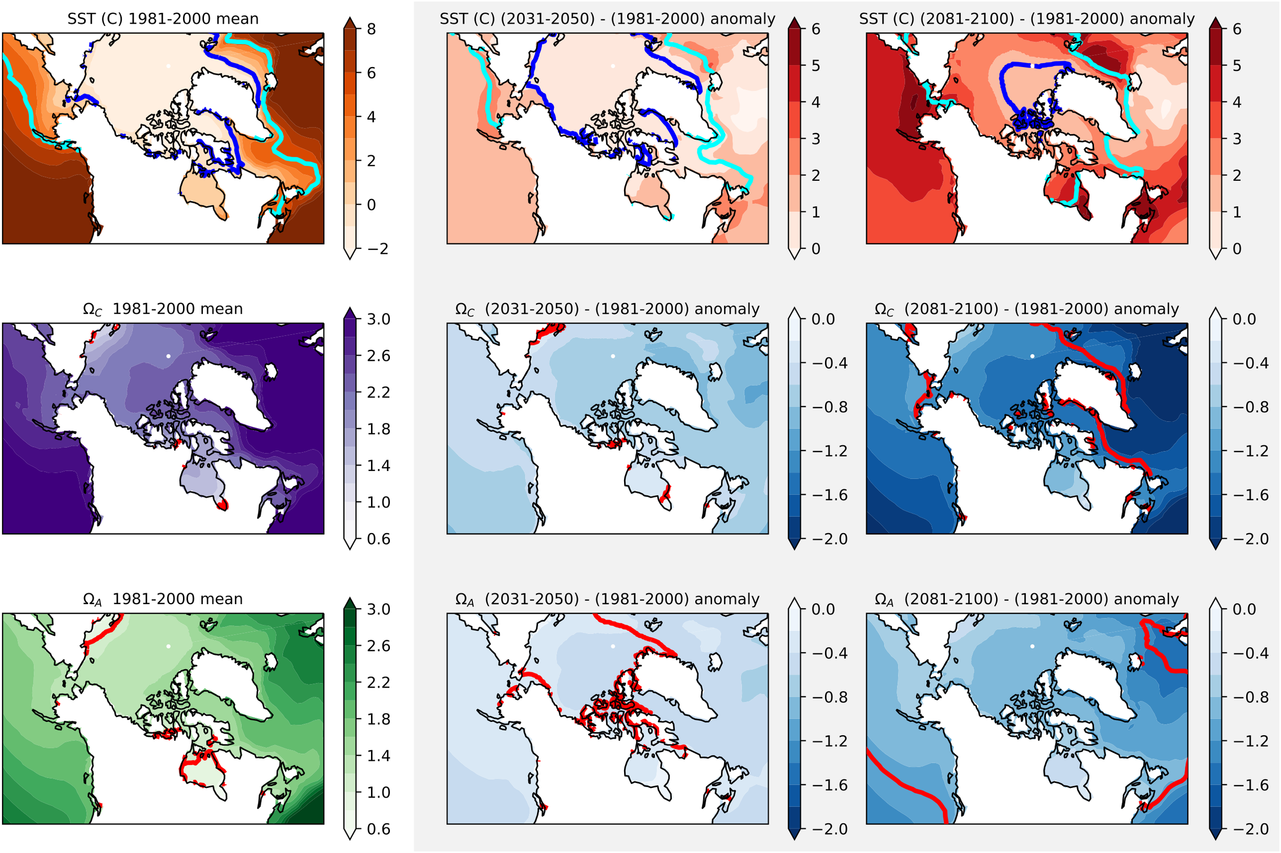 Maps of simulated temperature (top row), and surface ocean aragonite (ΩA, middle row) and calcite saturation state (ΩC, bottom row) from model output for the historical climate (1981-2000) (left panels) and projected changes for the mid- (2031–2050 minus 1981-2000, middle panels) and late (2081–2100 minus 1981-2000, right panels) 21st century, with projected changes (middle and right columns) highlighted by a shaded box. The right-hand colour bars for the left column indicate mean simulated temperature/saturation states for 1981-2000, whereas the colour bars for the middle and right plots on each row represent the anomalies with respect to 1981-2000. Dark blue lines indicate the 0°C contour, cyan the 5°C contour and red the Ω=1 contour. Model estimates are calculated from DIC, alkalinity, temperature, and salinity from Earth System Model simulations and are the mean of ten models (ACCESS-ESM1-5, CanESM5-CanOE, CESM2-WACCM, CNRM-ESM2-1, GFDL-ESM4, MIROC-ES2L, MPI-ESM1-2-HR, MRI-ESM2-0, NorESM2-MM, and UKESM1-0-LL). Future projections are for the high-emission scenario SSP585.