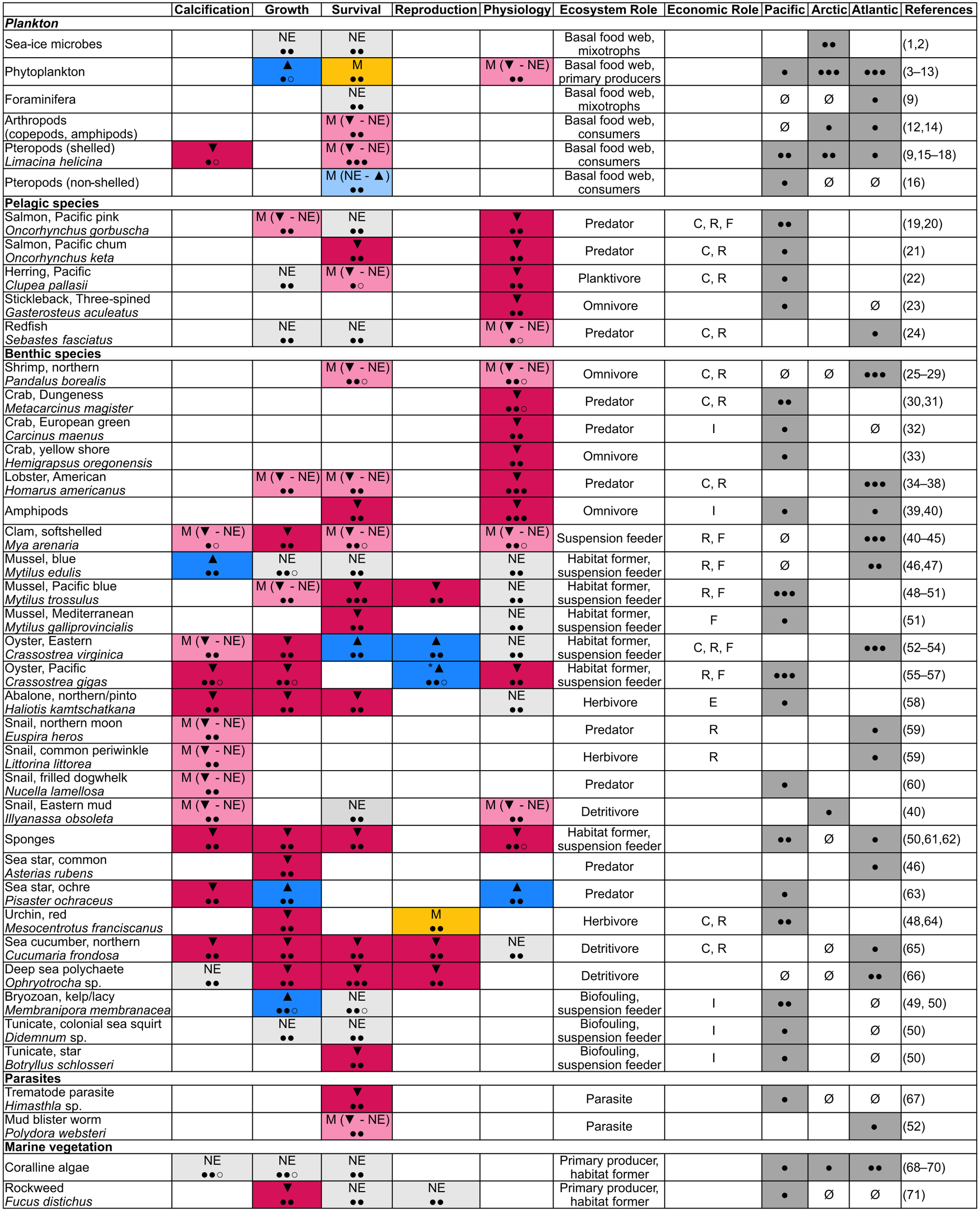 Table showing species responses to OA from studies conducted in Canada. Responses are: ▼ – negative, ▲ – positive, NE – no effect, M – mixed (positive, negative, no effect), M (▼ - NE) – mixed (negative - no effect), M (NE - ▲) – mixed (no effect -positive), *Selectively bred oysters showed increased resilience to OA. Confidence levels follow the style of IPCC WG II (IPCC, 2023) in terms of number of studies and are: ● – low, ●○ – medium low, ●● – medium, ●●○ – medium high, ●●● – high. Economic Role abbreviations: C – commercial fishery, R – recreational fishery, F – farmed/aquaculture, I – invasive species, E – endangered species. Ranges (Pacific, Arctic, Atlantic): ● – present, low evidence (1 study), ●● – present, medium evidence (2 studies), ●●● – present, high evidence (3+ studies), Ø – present, no data. References: 1 (Monier et al., 2014); 2 (Torstensson et al., 2021); 3 (Hattenrath-Lehmann et al., 2015); 4 (Mélançon et al., 2016); 5 (Hoppe et al., 2017); 6 (Hoppe et al., 2018a); 7 (Hoppe et al., 2018b); 8 (Hussherr et al., 2017); 9 (Maillet and Pepin, 2017); 10 (Bénard et al., 2018); 11 (Bénard et al., 2019); 12 (Murphy et al., 2020); 13 (Bénard et al., 2021); 14 (Lewis et al., 2013); 15 (Comeau et al., 2012); 16 (Mackas and Galbraith, 2012); 17 (Niemi et al., 2021); 18 (Miller et al., 2023); 19 (Ou et al., 2015); 20 (Frommel et al., 2020); 21 (Frommel et al., 2025); 22 (Frommel et al., 2022); 23 (Soor et al., 2024); 24 (Guitard et al., 2025); 25 (Chemel et al., 2020); 26 (Guscelli et al., 2023a); 27 (Guscelli et al., 2023b); 28 (Feugere et al., 2025); 29 (Guscelli et al., 2025); 30 (Hans et al., 2014); 31 (Durant et al., 2023); 32 (Fehsenfeld and Weihrauch, 2013); 33 (Khodikian et al., 2025); 34 (Keppel et al., 2012); 35 (Klymasz-Swartz et al., 2019); 36 (Menu-Courey et al., 2019); 37 (Noisette et al., 2021); 38 (Tai et al., 2021a); 39 (Lim and Harley, 2018); 40 (McGarrigle et al., 2023); 41 (Clements and Hunt, 2014); 42 (Clements and Hunt, 2018); 43 (Clements et al., 2016); 44 (Clements et al., 2017a); 45 (McGarrigle and Hunt, 2023); 46 (Keppel et al., 2015); 47 (Clements et al., 2018c); 48 (Sunday et al., 2011); 49 (Brown et al., 2016); 50 (Brown et al., 2020); 51 (Thyrring et al., 2023); 52 (Clements et al., 2017b); 53 (Clements et al., 2018b); 54 (Clements et al., 2021); 55 (Nordio et al., 2021); 56 (Wright-LaGreca et al., 2022); 57 (Zhong et al., 2024); 58 (Crim et al., 2011); 59 (Clements et al., 2018a); 60 (Nienhuis et al., 2010); 61 (Robertson et al., 2017); 62 (Stevenson et al., 2020); 63 (Gooding et al., 2009); 64 (Reuter et al., 2011); 65 (Verkaik et al., 2016); 66 (Verkaik et al., 2017); 67 (Franzova et al., 2019); 68 (Rahman and Halfar, 2014); 69 (Martone et al., 2021); 70 (Williams et al., 2021); 71 (Schiltroth et al., 2019). Paper metadata and full responses across all species and life stages (e.g., larval, juvenile, adult) with experimental/in situ and species response details can be found in Supplementary Tables S4 and S5.
