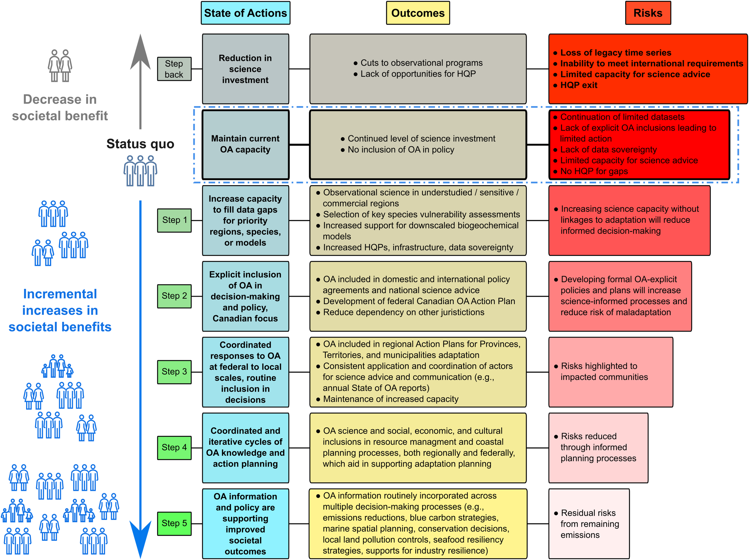 Ocean acidification (OA) generally receives far less consideration than other climate stressors and related hazards, such as global warming and extreme weather events. Canada is uniquely vulnerable to OA given its extensive coastal oceans, the oceanographic processes in its three basins, accelerated warming and sea-ice melt, and extensive coastal communities and maritime economic sectors. Canada’s coastline is also home to extensive and diverse First Nations peoples with distinct histories, rights, title, laws, governance and whose traditions and cultures are extrinsically linked to the sea. However, there are currently very limited pathways to support OA action, mitigation, and/or adaptation in Canada, particularly at the policy level. Here, we present a first synthesis of the current state of OA knowledge across Canada's Pacific, Arctic, and Atlantic regions, including monitoring, modelling, biological responses, socioeconomic and policy perspectives, and examples of existing OA actions and efforts at local and provincial levels. We also suggest a step-wise pathway for actions to enhance the coordinated filling of OA knowledge gaps and integration of OA knowledge into decision-making frameworks. The goals of these recommendations are to improve our ability to respond to OA in Canada, and minimize risks to coastal marine environments and ecosystems, vulnerable sectors, and communities.