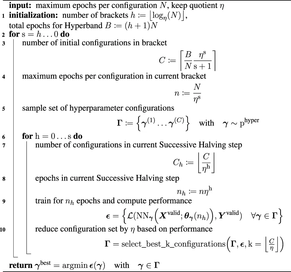 Unfortunately, the number of epochs to train before deciding on discarding low-performing configurations constitutes another hyperparameter, which depends on the mechanical problem. Either Successive Halving can explore more configurations C for fewer epochs n or investigate fewer configurations C for more epochs n per decision. Li et al. (2017) solved this exploration issue with the Hyperband search algorithm (Algorithm 1). By gathering groups of configurations in h brackets, Successive Halving can be applied for different numbers of epochs nh per group. The first bracket s = h maximizes exploration to test many configurations C with Successive Halving, identifying promising positions even for vast search domains and non-convex or non-smooth loss functions. In the last bracket s = 0, fewer configurations are tested for the full number of epochs, similar to a conventional random search. This is advantageous if the search domain is narrow and the objective functions are convex and smooth. Thus, Hyperband combines efficient exploration and investigation of promising architectures and does not introduce additional hyperparameters to be tuned.